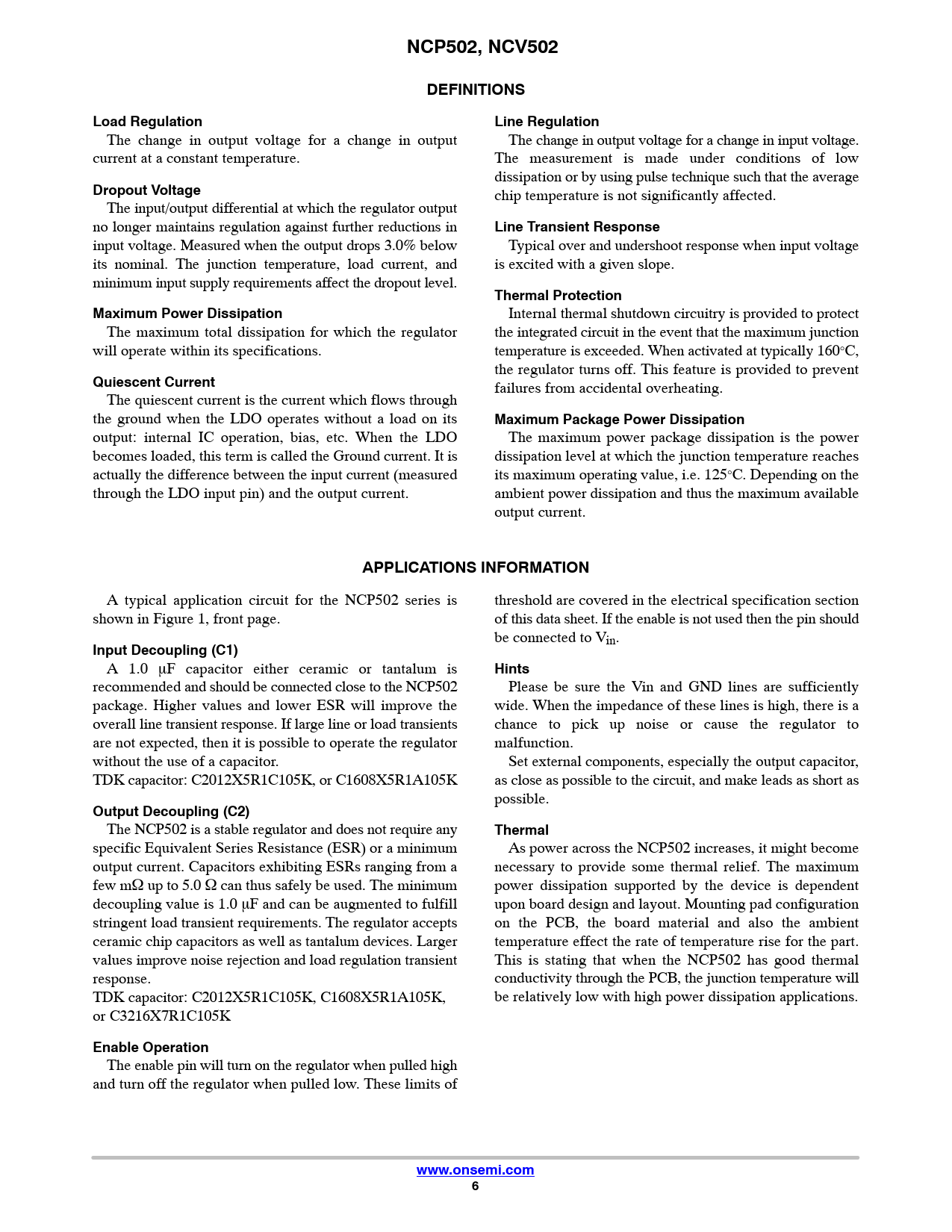 NCP502, NCV502. DEFINITIONS. Load Regulation. Line Regulation. Dropout Voltage. Line Transient Response. Thermal Protection