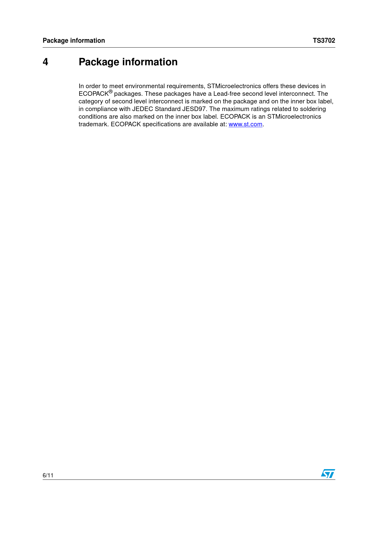 Package informationTS37024 Packageinformation In order to meet environmental requirements, STMicroelectronics offers these devices in ECOPACK® packages. These packages have a Lead-free second level interconnect. The category of second level interconnect is marked on the package and on the inner box label, in compliance with JEDEC Standard JESD97. The maximum ratings related to soldering conditions are also marked on the inner box label. ECOPACK is an STMicroelectronics trademark. ECOPACK specifications are available at: www.st.com. 6/11 Document Outline 1 Schematic diagram Figure 1. Schematic diagram (for 1/2 TS3702) 2 Absolute maximum ratings and operating conditions Table 1. Absolute maximum ratings Table 2. Operating conditions 3 Electrical characteristics Table 3. VCC+ = 3V, Vcc- = 0V, Tamb = 25˚C (unless otherwise specified) Table 4. VCC+ = 5V, Vcc- = 0V, Tamb = 25˚C (unless otherwise specified) 4 Package information 4.1 DIP8 package mechanical data 4.2 SO8 package mechanical data 4.3 TSSOP8 package mechanical data 5 Ordering information Table 5. Order codes 6 Revision history