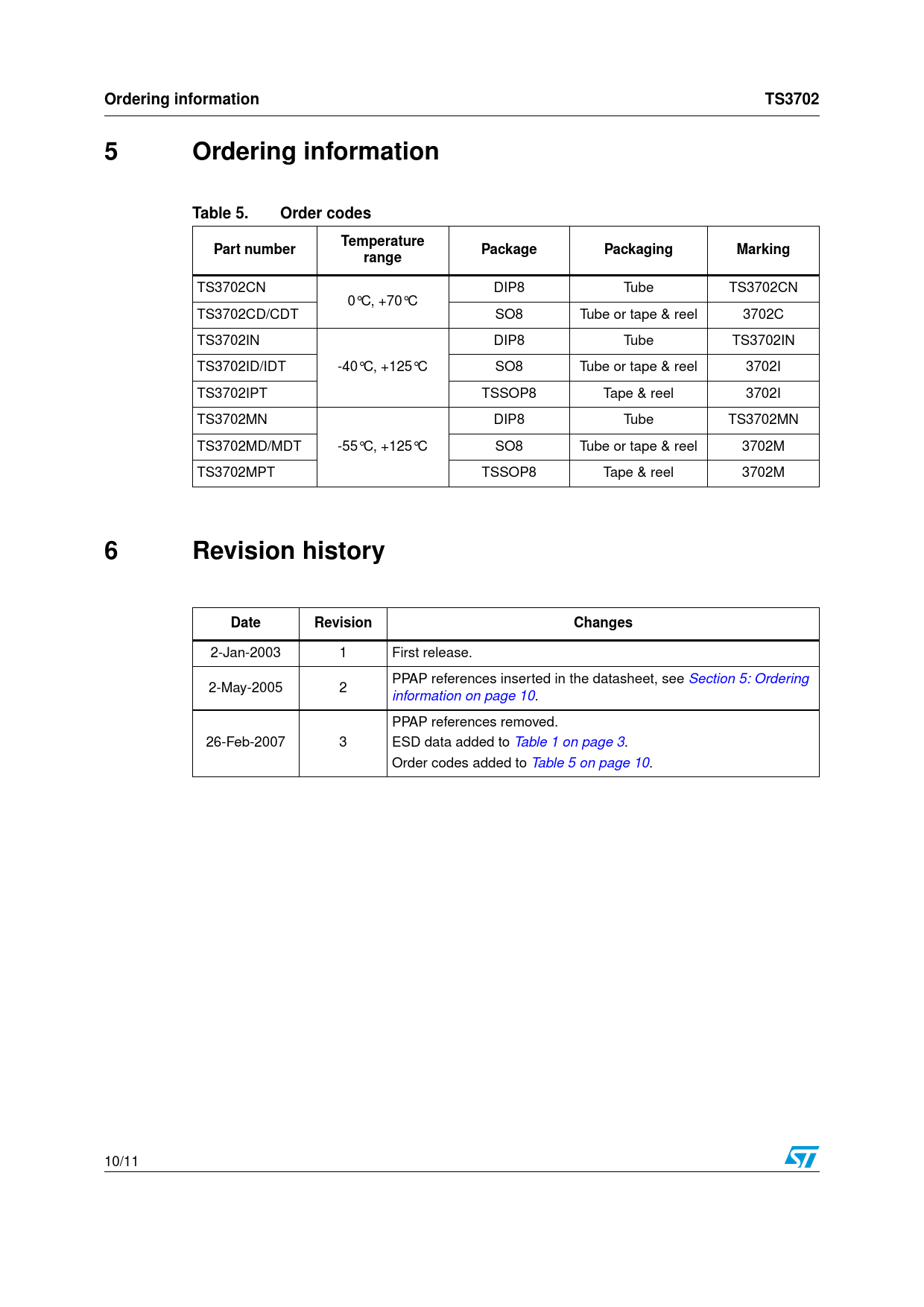 Ordering information. TS3702. 5 Ordering. information. Table 5. Order codes. Temperature. Part number. Package. Packaging. Marking. range
