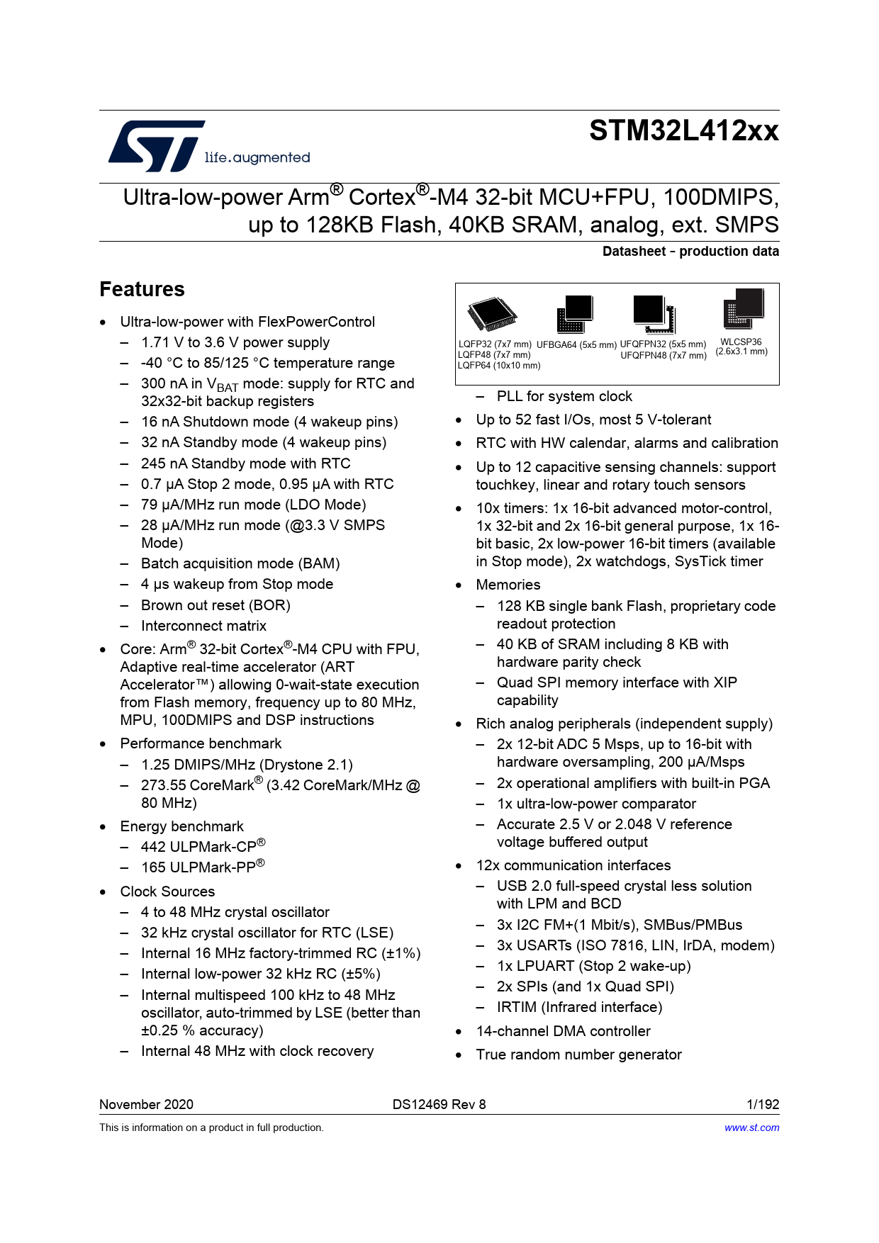 | Seiten / Seite | 192 / 1 — STM32L412xx. Datasheet. production data. Features |