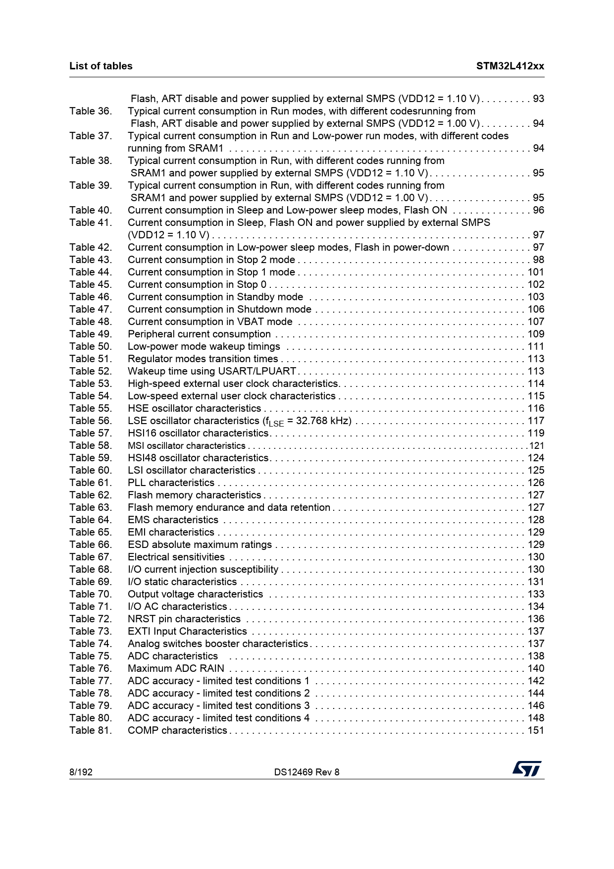 link to page 93 link to page 94 link to page 94 link to page 95 link to page 95 link to page 96 link to page 97 link to page 97 link to page 98 link to page 101 link to page 102 link to page 103 link to page 106 link to page 107 link to page 109 link to page 111 link to page 113 link to page 113 link to page 114 link to page 115 link to page 116 link to page 117 link to page 119 link to page 121 link to page 124 link to page 125 link to page 126 link to page 127 link to page 127 link to page 128 link to page 129 link to page 129 link to page 130 link to page 130 link to page 131 link to page 133 link to page 134 link to page 136 link to page 137 link to page 137 link to page 138 link to page 140 link to page 142 link to page 144 link to page 146 link to page 148 link to page 151 List of tablesSTM32L412xx Flash, ART disable and power supplied by external SMPS (VDD12 = 1.10 V) . 93 Table 36. Typical current consumption in Run modes, with different codesrunning from Flash, ART disable and power supplied by external SMPS (VDD12 = 1.00 V) . 94 Table 37. Typical current consumption in Run and Low-power run modes, with different codes running from SRAM1 . 94 Table 38. Typical current consumption in Run, with different codes running from SRAM1 and power supplied by external SMPS (VDD12 = 1.10 V) . 95 Table 39. Typical current consumption in Run, with different codes running from SRAM1 and power supplied by external SMPS (VDD12 = 1.00 V) . 95 Table 40. Current consumption in Sleep and Low-power sleep modes, Flash ON . 96 Table 41. Current consumption in Sleep, Flash ON and power supplied by external SMPS (VDD12 = 1.10 V) . 97 Table 42. Current consumption in Low-power sleep modes, Flash in power-down . 97 Table 43. Current consumption in Stop 2 mode . 98 Table 44. Current consumption in Stop 1 mode . 101 Table 45. Current consumption in Stop 0 . 102 Table 46. Current consumption in Standby mode . 103 Table 47. Current consumption in Shutdown mode . 106 Table 48. Current consumption in VBAT mode . 107 Table 49. Peripheral current consumption . 109 Table 50. Low-power mode wakeup timings . 111 Table 51. Regulator modes transition times . 113 Table 52. Wakeup time using USART/LPUART . 113 Table 53. High-speed external user clock characteristics. 114 Table 54. Low-speed external user clock characteristics . 115 Table 55. HSE oscillator characteristics . 116 Table 56. LSE oscillator characteristics (fLSE = 32.768 kHz) . 117 Table 57. HSI16 oscillator characteristics. 119 Table 58. MSI oscillator characteristics . .121 Table 59. HSI48 oscillator characteristics. 124 Table 60. LSI oscillator characteristics . 125 Table 61. PLL characteristics . 126 Table 62. Flash memory characteristics . 127 Table 63. Flash memory endurance and data retention . 127 Table 64. EMS characteristics . 128 Table 65. EMI characteristics . 129 Table 66. ESD absolute maximum ratings . 129 Table 67. Electrical sensitivities . 130 Table 68. I/O current injection susceptibility . 130 Table 69. I/O static characteristics . 131 Table 70. Output voltage characteristics . 133 Table 71. I/O AC characteristics . 134 Table 72. NRST pin characteristics . 136 Table 73. EXTI Input Characteristics . 137 Table 74. Analog switches booster characteristics . 137 Table 75. ADC characteristics . 138 Table 76. Maximum ADC RAIN . 140 Table 77. ADC accuracy - limited test conditions 1 . 142 Table 78. ADC accuracy - limited test conditions 2 . 144 Table 79. ADC accuracy - limited test conditions 3 . 146 Table 80. ADC accuracy - limited test conditions 4 . 148 Table 81. COMP characteristics . 151 8/192 DS12469 Rev 8 Document Outline Table 1. Device summary 1 Introduction 2 Description Table 2. STM32L412xx family device features and peripheral counts Figure 1. STM32L412xx block diagram 3 Functional overview 3.1 Arm® Cortex®-M4 core with FPU 3.2 Adaptive real-time memory accelerator (ART Accelerator™) 3.3 Memory protection unit 3.4 Embedded Flash memory Table 3. Access status versus readout protection level and execution modes 3.5 Embedded SRAM 3.6 Firewall 3.7 Boot modes 3.8 Cyclic redundancy check calculation unit (CRC) 3.9 Power supply management 3.9.1 Power supply schemes Figure 2. Power supply overview Figure 3. Power-up/down sequence 3.9.2 Power supply supervisor 3.9.3 Voltage regulator 3.9.4 Low-power modes Table 4. STM32L412xx modes overview Table 5. Functionalities depending on the working mode 3.9.5 Reset mode 3.9.6 VBAT operation 3.10 Interconnect matrix Table 6. STM32L412xx peripherals interconnect matrix 3.11 Clocks and startup Figure 4. Clock tree 3.12 General-purpose inputs/outputs (GPIOs) 3.13 Direct memory access controller (DMA) Table 7. DMA implementation 3.14 Interrupts and events 3.14.1 Nested vectored interrupt controller (NVIC) 3.14.2 Extended interrupt/event controller (EXTI) 3.15 Analog to digital converter (ADC) 3.15.1 Temperature sensor Table 8. Temperature sensor calibration values 3.15.2 Internal voltage reference (VREFINT) Table 9. Internal voltage reference calibration values 3.15.3 VBAT battery voltage monitoring 3.16 Comparators (COMP) 3.17 Operational amplifier (OPAMP) 3.18 Touch sensing controller (TSC) 3.19 Random number generator (RNG) 3.20 Timers and watchdogs Table 10. Timer feature comparison 3.20.1 Advanced-control timer (TIM1) 3.20.2 General-purpose timers (TIM2, TIM15, TIM16) 3.20.3 Basic timer (TIM6) 3.20.4 Low-power timer (LPTIM1 and LPTIM2) 3.20.5 Infrared interface (IRTIM) 3.20.6 Independent watchdog (IWDG) 3.20.7 System window watchdog (WWDG) 3.20.8 SysTick timer 3.21 Real-time clock (RTC) and backup registers 3.22 Inter-integrated circuit interface (I2C) Table 11. I2C implementation 3.23 Universal synchronous/asynchronous receiver transmitter (USART) Table 12. STM32L412xx USART/UART/LPUART features 3.24 Low-power universal asynchronous receiver transmitter (LPUART) 3.25 Serial peripheral interface (SPI) 3.26 Universal serial bus (USB) 3.27 Clock recovery system (CRS) 3.28 Quad SPI memory interface (QUA