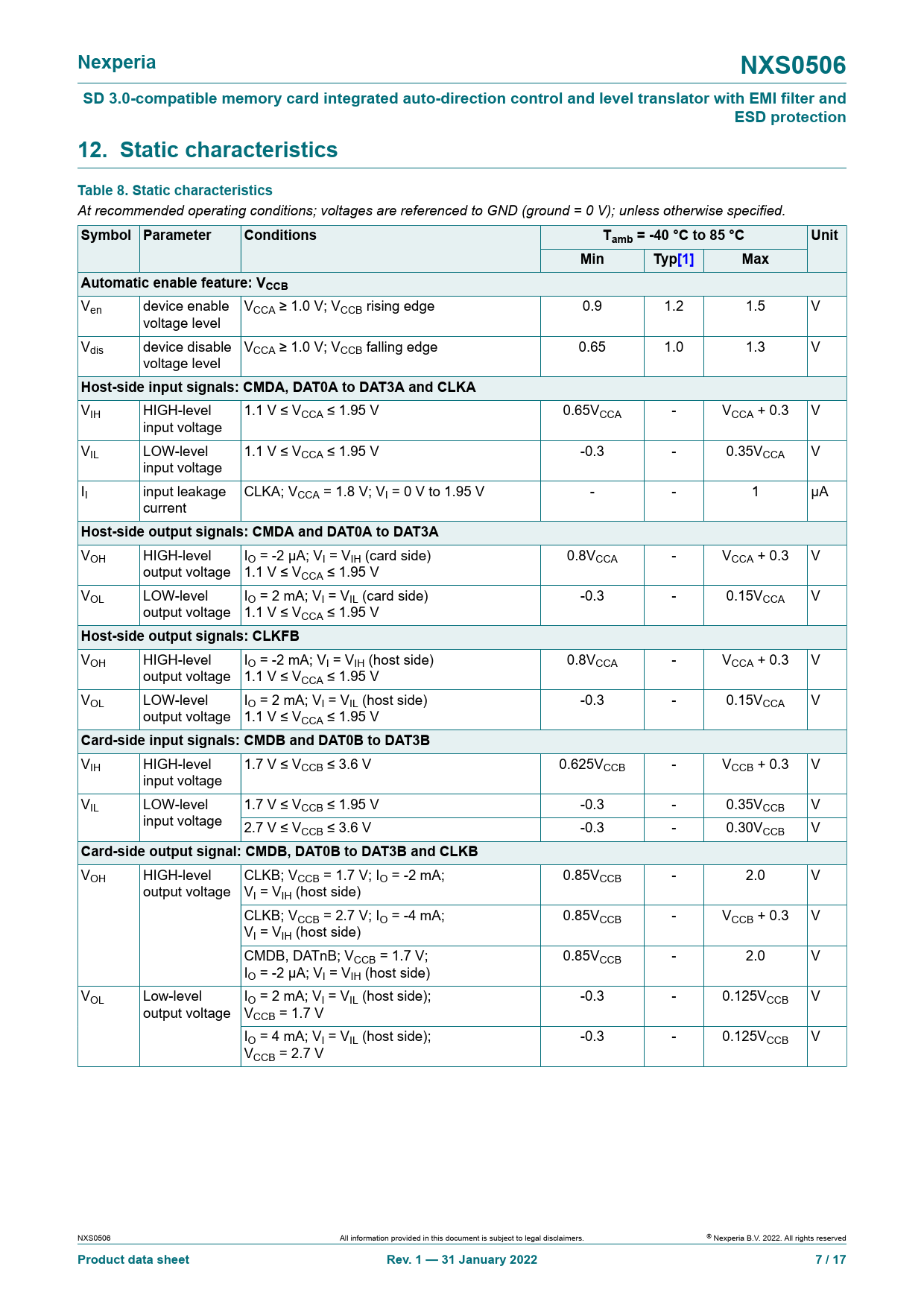 Nexperia NXS0506 SD 3.0-compatible memory card integrated auto-direction control and level translator with EMI filter and ESD protection 12. Static characteristics Table 8. Static characteristics