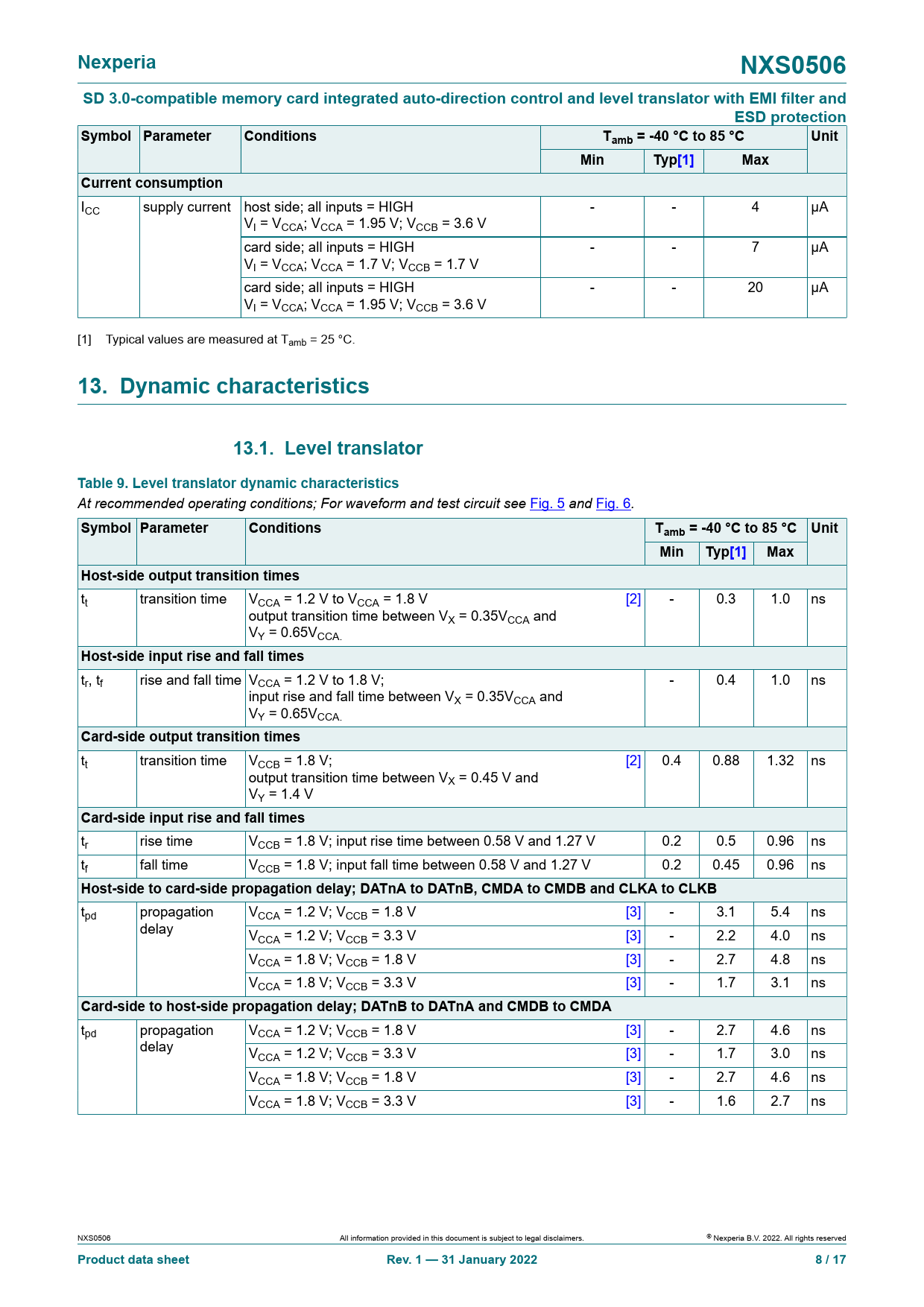 Nexperia NXS0506 SD 3.0-compatible memory card integrated auto-direction control and level translator with EMI filter and ESD protection Symbol Parameter Conditions Tamb = -40 °C to 85 °C Unit Min Typ[1] Max Current consumption