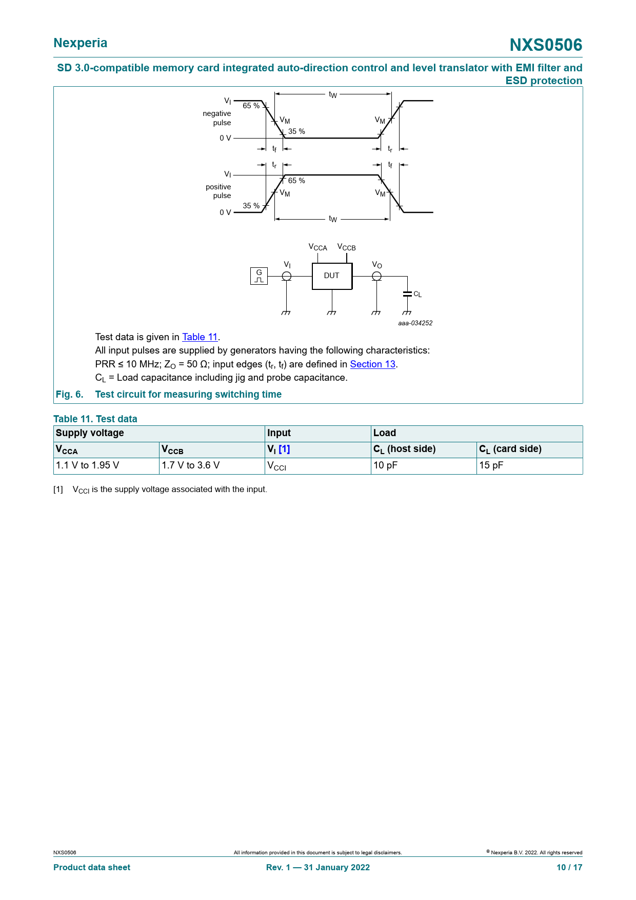 1.1 V to 1.95 V 1.7 V to 3.6 V VCCI 10 pF 15 pF [1] VCCI is the supply voltage associated with the input. NXS0506 All information provided in this document is subject to legal disclaimers. © Nexperia B.V. 2022. Al rights reserved