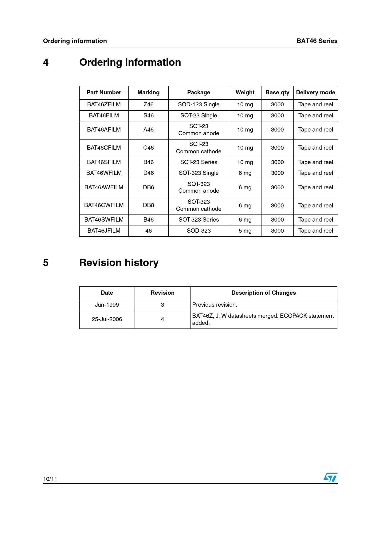 Ordering information BAT46 Series 4 Ordering information Part Number Marking Package Weight Base qty Delivery mode