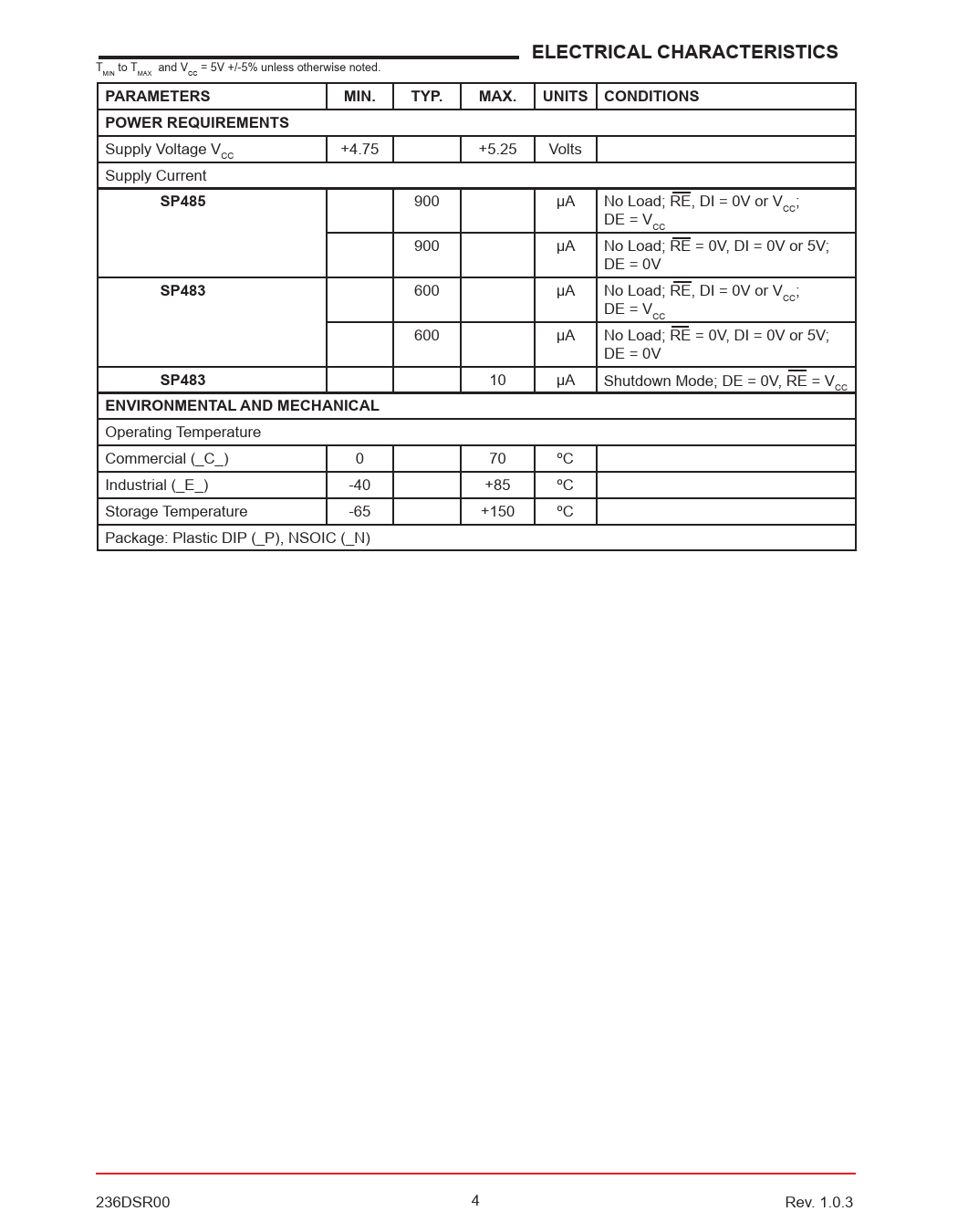 ELECTRICAL CHARACTERISTICS. PARAMETERS. MIN. TYP. MAX. UNITS CONDITIONS. POWER REQUIREMENTS. SP485. SP483. ENVIRONMENTAL AND MECHANICAL