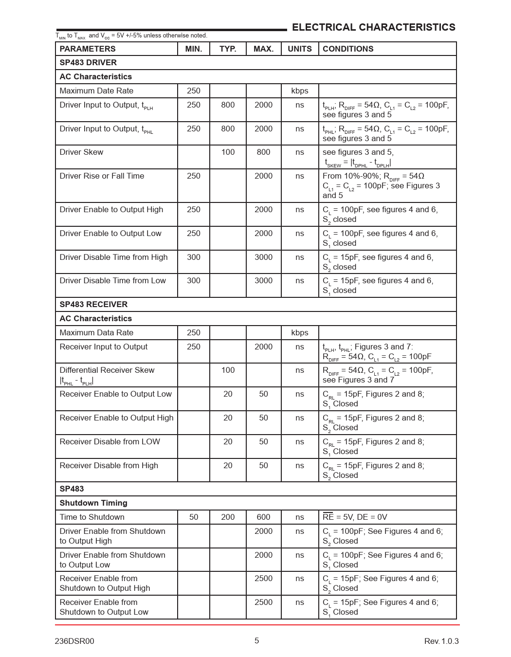 ELECTRICAL CHARACTERISTICS T to T and V = 5V +/-5% unless otherwise noted. MIN MAX CC PARAMETERSMIN.TYP.MAX.UNITS CONDITIONSSP483 DRIVER AC Characteristics Maximum Date Rate 250 kbps Driver Input to Output, t 250 800 2000 ns t ; R = 54Ω, C = C = 100pF, PLH PLH DIFF L1 L2 see figures 3 and 5 Driver Input to Output, t 250 800 2000 ns t ; R = 54Ω, C = C = 100pF, PHL PHL DIFF L1 L2 see figures 3 and 5 Driver Skew 100 800 ns see figures 3 and 5, t = |t - t | SKEW DPHL DPLH Driver Rise or Fall Time 250 2000 ns From 10%-90%; R = 54Ω DIFF C = C = 100pF; see Figures 3 L1 L2 and 5 Driver Enable to Output High 250 2000 ns C = 100pF, see figures 4 and 6, L S closed 2 Driver Enable to Output Low 250 2000 ns C = 100pF, see figures 4 and 6, L S closed 1 Driver Disable Time from High 300 3000 ns C = 15pF, see figures 4 and 6, L S closed 2 Driver Disable Time from Low 300 3000 ns C = 15pF, see figures 4 and 6, L S closed 1 SP483 RECEIVER AC Characteristics Maximum Data Rate 250 kbps Receiver Input to Output 250 2000 ns t , t ; Figures 3 and 7: PLH PHL R = 54Ω, C = C = 100pF DIFF L1 L2 Differential Receiver Skew 100 ns R = 54Ω, C = C = 100pF, DIFF L1 L2 |t - t | see Figures 3 and 7 PHL PLH Receiver Enable to Output Low 20 50 ns C = 15pF, Figures 2 and 8; RL S Closed 1 Receiver Enable to Output High 20 50 ns C = 15pF, Figures 2 and 8; RL S Closed 2 Receiver Disable from LOW 20 50 ns C = 15pF, Figures 2 and 8; RL S Closed 1 Receiver Disable from High 20 50 ns C = 15pF, Figures 2 and 8; RL S Closed 2 SP483 Shutdown Timing Time to Shutdown 50 200 600 ns RE = 5V, DE = 0V Driver Enable from Shutdown 2000 ns C = 100pF; See Figures 4 and 6; L to Output High S Closed 2 Driver Enable from Shutdown 2000 ns C = 100pF; See Figures 4 and 6; L to Output Low S Closed 1 Receiver Enable from 2500 ns C = 15pF; See Figures 4 and 6; L Shutdown to Output High S Closed 2 Receiver Enable from 2500 ns C = 15pF; See Figures 4 and 6; L Shutdown to Output Low S Closed 1 236DSR00 5 Rev. 1.0.3