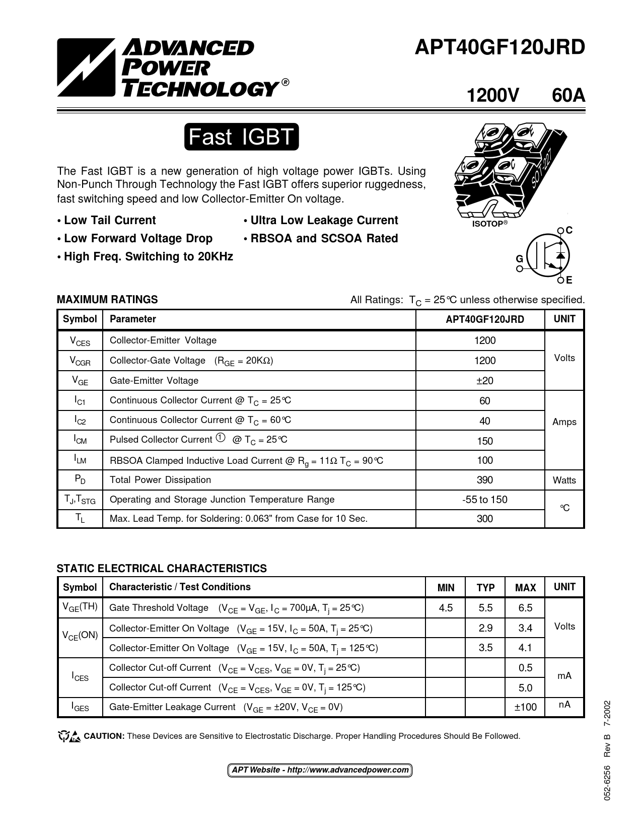 APT40GF120JRDAPT40GF120JRD1200V60A Fast IGBT EE The Fast IGBT is a new generation of high voltage power IGBTs. Using GC Non-Punch Through Technology the Fast IGBT offers superior ruggedness, SOT-227 fast switching speed and low Collector-Emitter On voltage. • Low Tail Current• Ultra Low Leakage Current"UL Recognized"ISOTOP ® C• Low Forward Voltage Drop• RBSOA and SCSOA Rated• High Freq. Switching to 20KHzGEMAXIMUM RATINGS All Ratings: TC = 25°C unless otherwise specified. SymbolParameterAPT40GF120JRDUNIT VCES Collector-Emitter Voltage 1200 V Volts CGR Collector-Gate Voltage (RGE = 20KΩ) 1200 VGE Gate-Emitter Voltage ±20 IC1 Continuous Collector Current @ TC = 25°C 60 IC2 Continuous Collector Current @ TC = 60°C 40 Amps ICM Pulsed Collector Current 1 @ TC = 25°C 150 ILM RBSOA Clamped Inductive Load Current @ Rg = 11Ω TC = 90°C 100 PD Total Power Dissipation 390 Watts TJ,TSTG Operating and Storage Junction Temperature Range -55 to 150 °C TL Max. Lead Temp. for Soldering: 0.063" from Case for 10 Sec. 300 STATIC ELECTRICAL CHARACTERISTICSSymbolCharacteristic / Test ConditionsMINTYPMAXUNIT VGE(TH) Gate Threshold Voltage (V 4.5 5.5 6.5 CE = VGE, I C = 700µA, Tj = 25°C) Collector-Emitter On Voltage (V 2.9 3.4 Volts GE = 15V, IC = 50A, Tj = 25°C) VCE(ON) Collector-Emitter On Voltage (V 3.5 4.1 GE = 15V, I C = 50A, Tj = 125°C) Collector Cut-off Current (V 0.5 CE = VCES, VGE = 0V, Tj = 25°C) ICES mA Collector Cut-off Current (VCE = VCES, VGE = 0V, Tj = 125°C) 5.0 I nA GES Gate-Emitter Leakage Current (VGE = ±20V, VCE = 0V) ±100 CAUTION: These Devices are Sensitive to Electrostatic Discharge. Proper Handling Procedures Should Be Followed. APT Website - http://www.advancedpower.com 052-6256 Rev B 7-2002