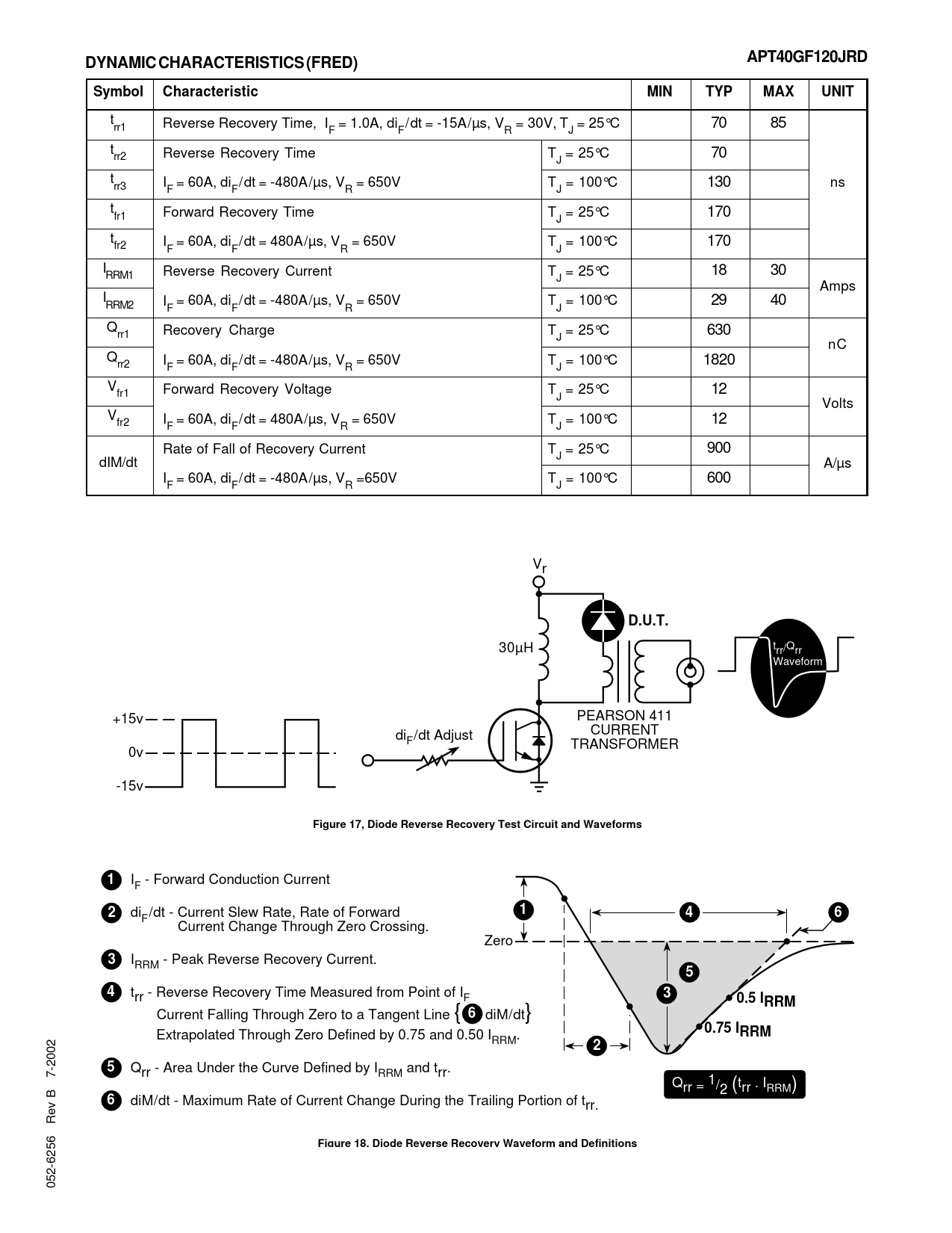 APT40GF120JRDDYNAMIC CHARACTERISTICS (FRED)SymbolCharacteristicMINTYPMAXUNIT t Reverse Recovery Time, I = 1.0A, di /dt = -15A/µs, V = 30V, T = 25°C rr1 70 85 F F R J t Reverse Recovery Time T = 25°C rr2 70 J t I = 60A, di /dt = -480A/µs, V = 650V T = 100°C 130 ns rr3 F F R J t Forward Recovery Time T = 25°C 170 fr1 J t I = 60A, di /dt = 480A/µs, V = 650V T = 100°C 170 fr2 F F R J I Reverse Recovery Current T = 25°C 18 30 RRM1 J Amps I I = 60A, di /dt = -480A/µs, V = 650V T = 100°C 29 40 RRM2 F F R J Q Recovery Charge T = 25°C 630 rr1 J nC Q I = 60A, di /dt = -480A/µs, V = 650V T = 100°C 1820 rr2 F F R J Vfr1 Forward Recovery Voltage T = 25°C 12 J Volts Vfr2 I = 60A, di /dt = 480A/µs, V = 650V T = 100°C 12 F F R J Rate of Fall of Recovery Current T = 25°C 900 J dIM/dt A/µs I = 60A, di /dt = -480A/µs, V =650V T = 100°C 600 F F R J Vr D.U.T. t 30µH rr/Qrr Waveform PEARSON 411 +15v CURRENT di /dt Adjust F TRANSFORMER 0v -15v Figure 17, Diode Reverse Recovery Test Circuit and Waveforms1 I - Forward Conduction Current F 12 di /dt - Current Slew Rate, Rate of Forward 46 F Current Change Through Zero Crossing. Zero 3 I - Peak Reverse Recovery Current. RRM 54 t 3 rr - Reverse Recovery Time Measured from Point of IF 0.5 IRRM Current Falling Through Zero to a Tangent Line { 6 diM/dt} 0.75 I Extrapolated Through Zero Defined by 0.75 and 0.50 I . RRM RRM 25 Qrr - Area Under the Curve Defined by IRRM and trr. Qrr . I = 1/2 (trr RRM) 6 diM/dt - Maximum Rate of Current Change During the Trailing Portion of t rr. Figure 18, Diode Reverse Recovery Waveform and Definitions 052-6256 Rev B 7-2002