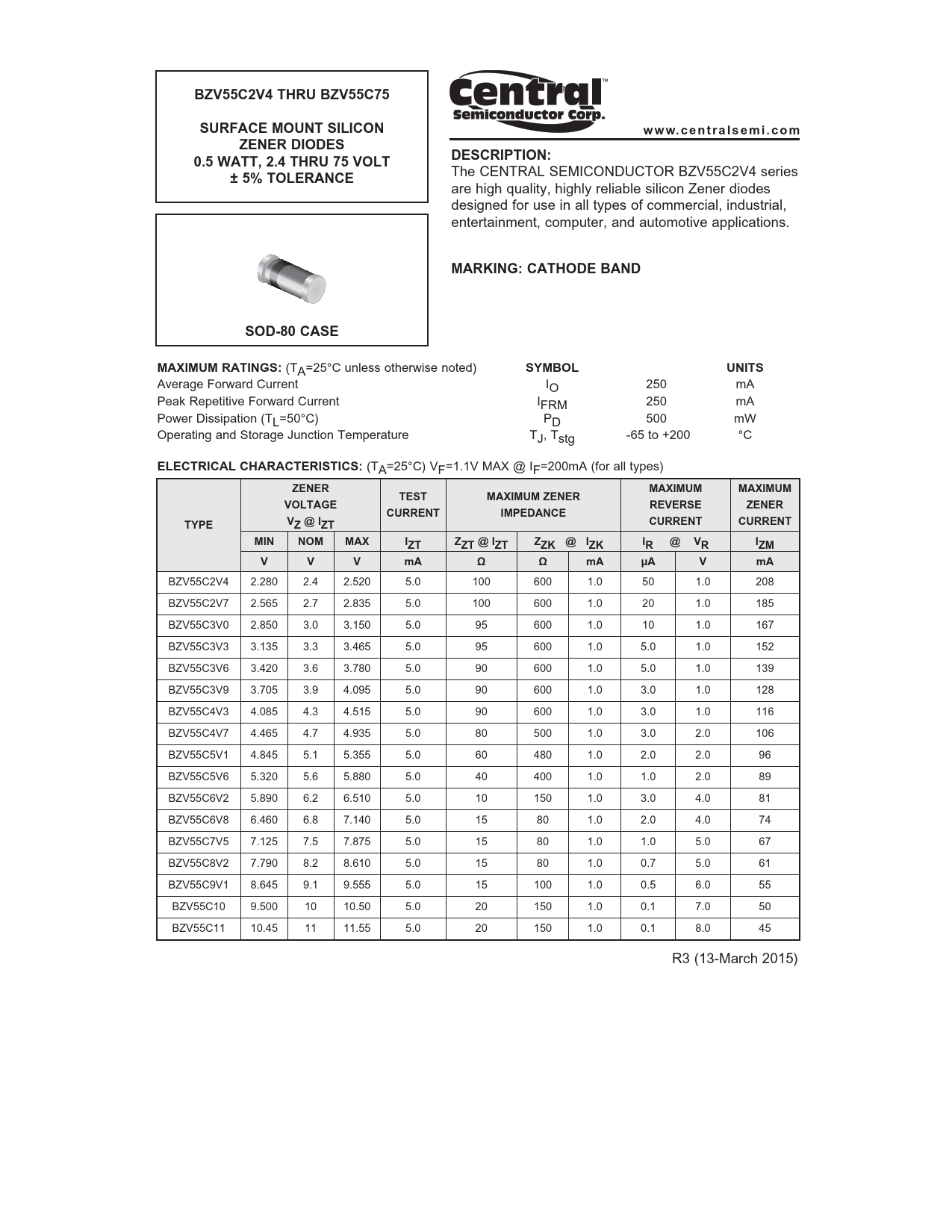 BZV55C2V4 THRU BZV55C75 SURFACE MOUNT SILICON w w w. c e n t r a l s e m i . c o m ZENER DIODES DESCRIPTION: 0.5 WATT, 2.4 THRU 75 VOLT ± 5% TOLERANCE
