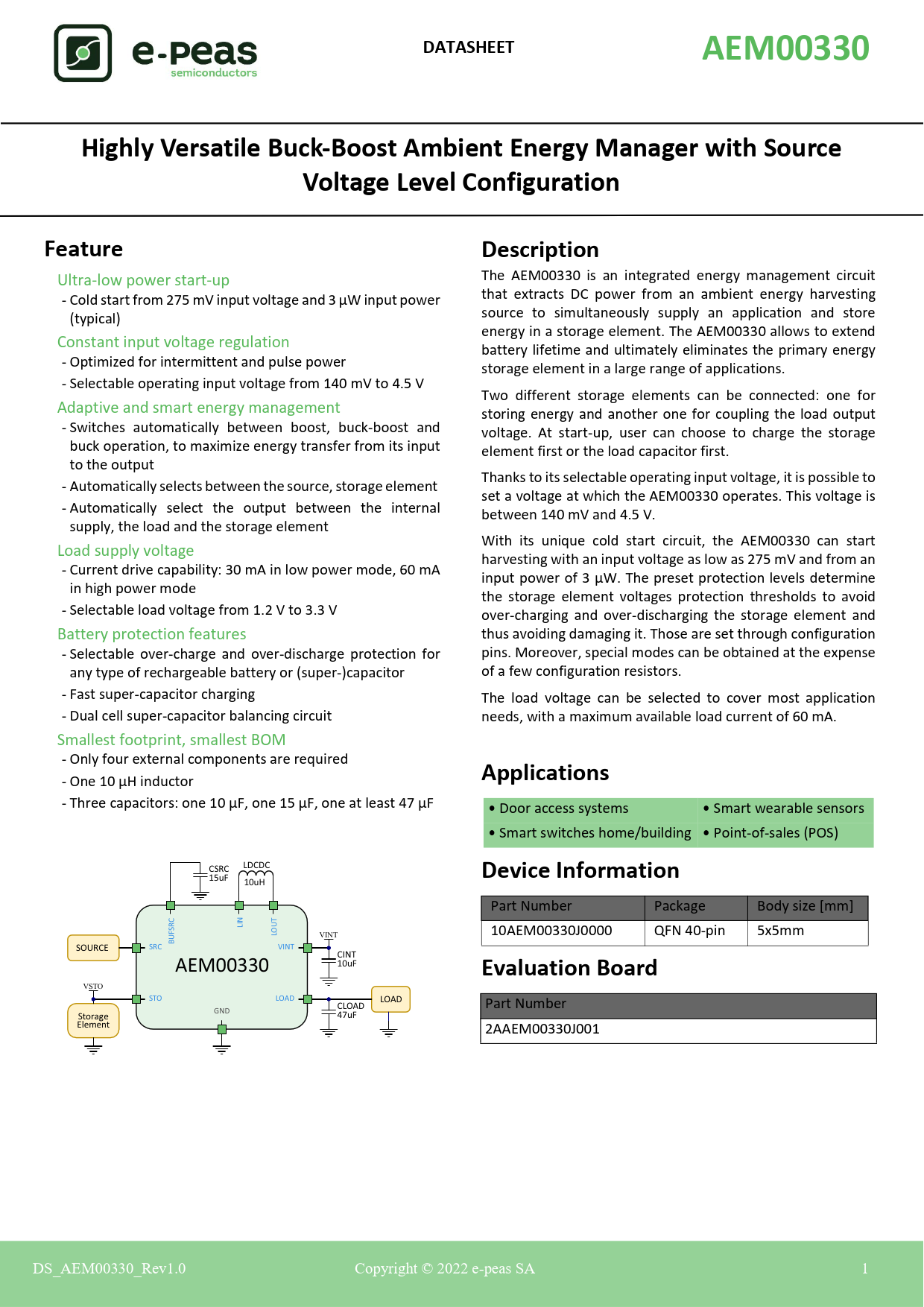 DATASHEET. AEM00330. Highly Versatile Buck-Boost Ambient Energy Manager with Source. Voltage Level Configuration. Feature