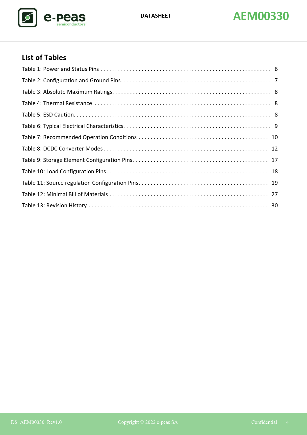 Table 1: Power and Status Pins . 6 Table 2: Configuration and Ground Pins. 7 Table 3: Absolute Maximum Ratings. 8 Table 4: Thermal Resistance . 8 Table 5: ESD Caution. 8 Table 6: Typical Electrical Characteristics . 9 Table 7: Recommended Operation Conditions . 10 Table 8: DCDC Converter Modes. 12 Table 9: Storage Element Configuration Pins. 17 Table 10: Load Configuration Pins. 18 Table 11: Source regulation Configuration Pins. 19 Table 12: Minimal Bil of Materials . 27 Table 13: Revision History . 30 DS_AEM00330_Rev1.0 Copyright © 2022 e-peas SA Confidential 4 Document Outline Table of Contents List of Tables 1. Introduction 2. Absolute Maximum Ratings 3. Thermal Resistance 4. Typical Electrical Characteristics at 25 °C 5. Recommended Operation Conditions 6. Functional Block Diagram 7. Theory of Operation 7.1. DCDC Converter 7.2. Reset, Wake Up and Start States 7.2.1. Storage Element Priority Supercapacitor as a Storage Element Battery as a Storage Element 7.2.2. Load Priority 7.3. Supply State 7.4. Shutdown State 7.5. Sleep State 7.6. Source Voltage Regulation 7.7. Balancing for Dual-Cell Supercapacitor 8. System Configuration 8.1. High Power / Low Power Mode 8.2. Storage Element Configuration 8.3. Load Configuration 8.4. Custom Mode Configuration 8.5. Disable Storage Element Charging 8.6. Source Level Configuration 8.7. External Components 8.7.1. Storage element information 8.7.2. External inductor information 8.7.3. External capacitors information CSRC CINT CLOAD 9. Typical Application Circuits 9.1. Example Circuit 1 9.2. Example Circuit 2 9.3. Circuit Behaviour 9.4. DCDC Conversion Efficiency From SRC to STO in Low Power Mode 9.4. DCDC Conversion Efficiency From SRC to STO in Low Power Mode 9.5. DCDC Conversion Efficiency From SRC to STO in High Power Mode 9.6. DCDC Conversion Efficiency From STO to LOAD in Low Power Mode 9.7. DCDC Conversion Efficiency From STO to LOAD in High Power Mode 10. Schematic 11. Layout 12. Package Information 12.1. Plastic Quad Flatpack No-Lead (QFN 40-pin 5x5mm) 12.2. Board Layout 13. Revision History