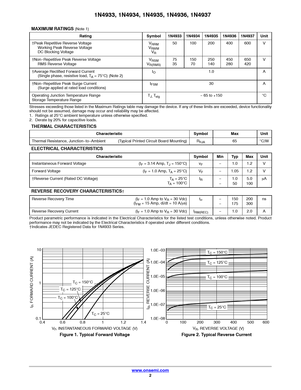 link to page 2 link to page 2 1N4933, 1N4934, 1N4935, 1N4936, 1N4937MAXIMUM RATINGS (Note 1) RatingSymbol1N4933 1N4934 1N4935 1N4936 1N4937Unit †Peak Repetitive Reverse Voltage VRRM 50 100 200 400 600 V Working Peak Reverse Voltage VRWM DC Blocking Voltage VR †Non−Repetitive Peak Reverse Voltage VRSM 75 150 250 450 650 V RMS Reverse Voltage VR(RMS) 35 70 140 280 420 †Average Rectified Forward Current IO 1.0 A (Single phase, resistive load, TA = 75°C) (Note 2) †Non−Repetitive Peak Surge Current IFSM 30 A (Surge applied at rated load conditions) Operating Junction Temperature Range TJ, Tstg − 65 to +150 °C Storage Temperature Range Stresses exceeding those listed in the Maximum Ratings table may damage the device. If any of these limits are exceeded, device functionality should not be assumed, damage may occur and reliability may be affected. 1. Ratings at 25°C ambient temperature unless otherwise specified. 2. Derate by 20% for capacitive loads. THERMAL CHARACTERISTICSCharacteristicSymbolMaxUnit Thermal Resistance, Junction−to−Ambient (Typical Printed Circuit Board Mounting) RqJA 65 °C/W ELECTRICAL CHARACTERISTICSCharacteristicSymbolMinTypMaxUnit Instantaneous Forward Voltage (IF = 3.14 Amp, TJ = 150°C) vF − 1.0 1.2 V Forward Voltage (IF = 1.0 Amp, TA = 25°C) VF − 1.05 1.2 V †Reverse Current (Rated DC Voltage) TA = 25°C IR − 1.0 5.0 mA TA = 100°C − 50 100 REVERSE RECOVERY CHARACTERISTICS † Reverse Recovery Time (IF = 1.0 Amp to VR = 30 Vdc) trr − 150 200 ns (IFM = 15 Amp, di/dt = 10 A/ms) − 175 300 Reverse Recovery Current (IF = 1.0 Amp to VR = 30 Vdc) IRM(REC) − 1.0 2.0 A Product parametric performance is indicated in the Electrical Characteristics for the listed test conditions, unless otherwise noted. Product performance may not be indicated by the Electrical Characteristics if operated under different conditions. †Indicates JEDEC Registered Data for 1N4933 Series. 10 1.0E−03 TC = 150°C 1.0E−04 TC = 125°C 1.0E−05 TC = 100°C 1 TC = 150°C ARD CURRENT (A) TC = 125°C 1.0E−06 W TC = 100°C , FOR I F , REVERSE CURRENT (A) 1.0E−07 I R TC = 25°C TC = 25°C 0.1 1.0E−08 0.4 0.6 0.8 1 1.2 1.4 0 100 200 300 400 500 600 VF, INSTANTANEOUS FORWARD VOLTAGE (V) VR, REVERSE VOLTAGE (V) Figure 1. Typical Forward VoltageFigure 2. Typical Reverse Currentwww.onsemi.com2