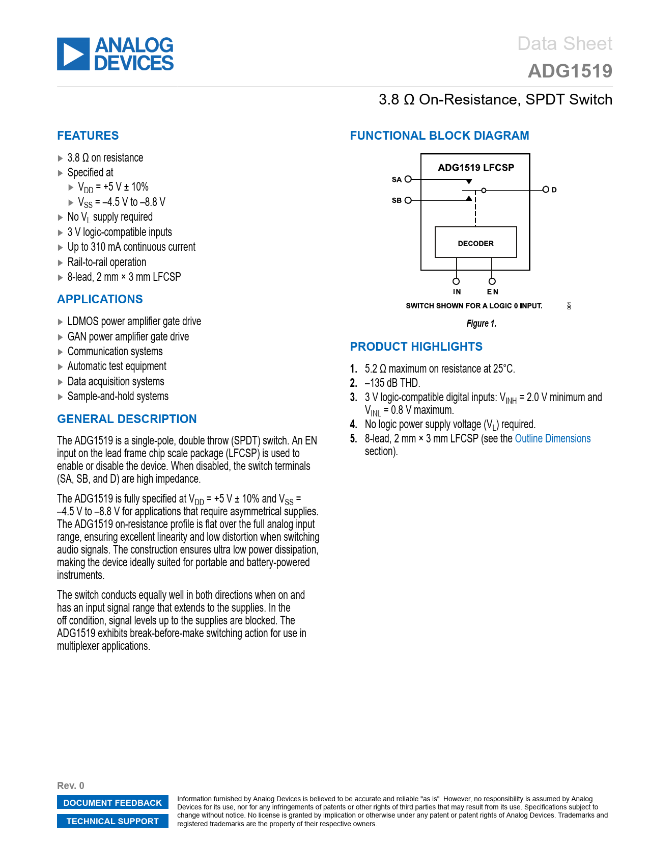 ADG1519. FEATURES. FUNCTIONAL BLOCK DIAGRAM. APPLICATIONS. Figure 1. PRODUCT HIGHLIGHTS. GENERAL DESCRIPTION. Rev. 0. DOCUMENT FEEDBACK