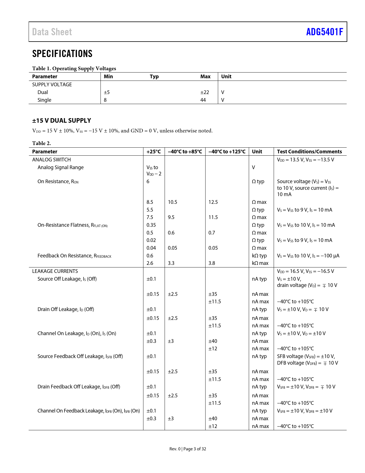 Data Sheet. ADG5401F. SPECIFICATIONS Table 1. Operating Supply Voltages Parameter. Min. Typ. Max. Unit. ±15 V DUAL SUPPLY