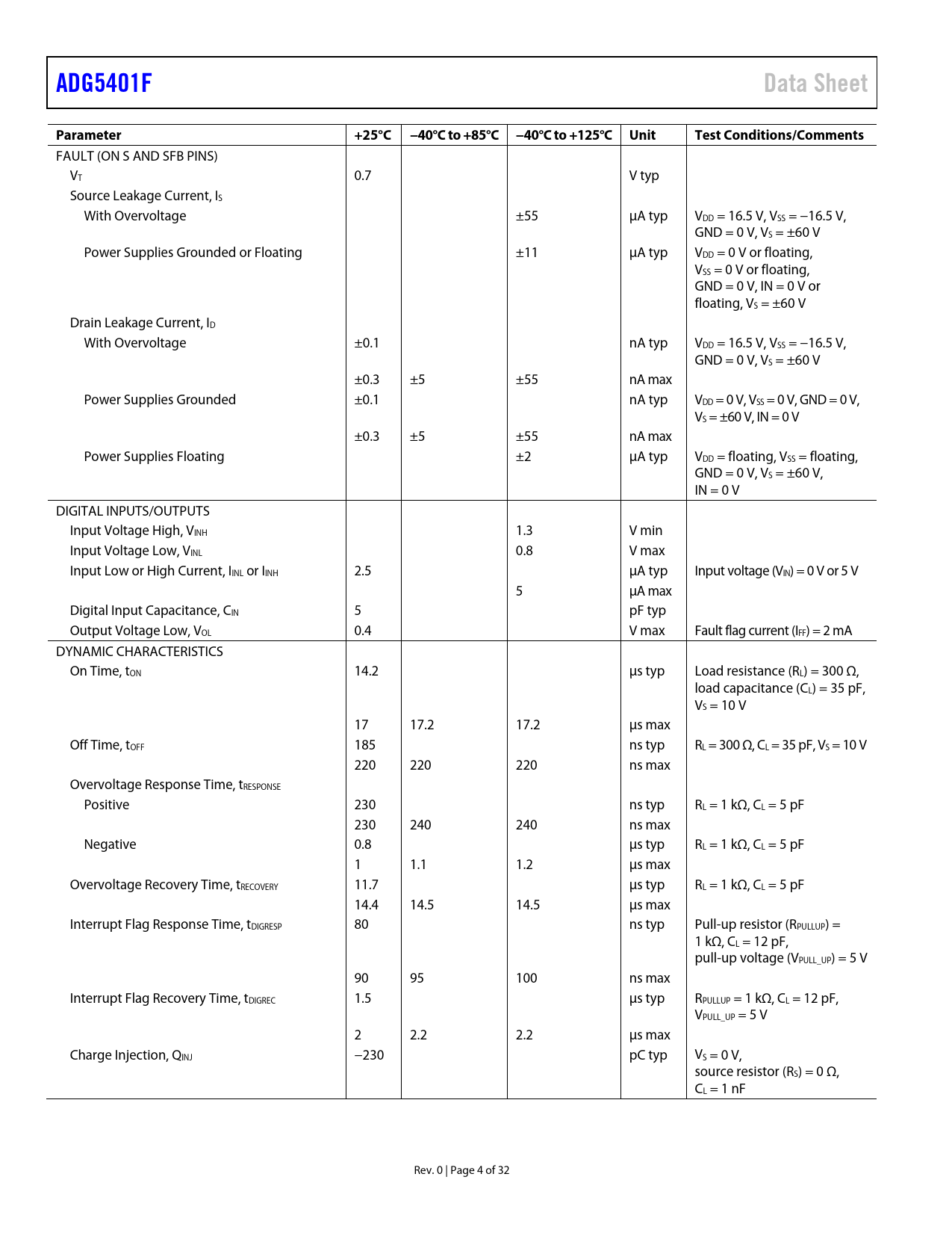 FAULT (ON S AND SFB PINS) VT 0.7 V typ Source Leakage Current, IS With Overvoltage ±55 µA typ VDD = 16.5 V, VSS = −16.5 V, GND = 0 V, VS = ±60 V Power Supplies Grounded or Floating ±11 µA typ VDD = 0 V or floating, VSS = 0 V or floating, GND = 0 V, IN = 0 V or floating, VS = ±60 V Drain Leakage Current, ID With Overvoltage ±0.1 nA typ VDD = 16.5 V, VSS = −16.5 V, GND = 0 V, VS = ±60 V ±0.3 ±5 ±55 nA max Power Supplies Grounded ±0.1 nA typ VDD = 0 V, VSS = 0 V, GND = 0 V, VS = ±60 V, IN = 0 V ±0.3 ±5 ±55 nA max Power Supplies Floating ±2 µA typ VDD = floating, VSS = floating, GND = 0 V, VS = ±60 V, IN = 0 V DIGITAL INPUTS/OUTPUTS Input Voltage High, VINH 1.3 V min Input Voltage Low, VINL 0.8 V max Input Low or High Current, IINL or IINH 2.5 µA typ Input voltage (VIN) = 0 V or 5 V 5 µA max Digital Input Capacitance, CIN 5 pF typ Output Voltage Low, VOL 0.4 V max Fault flag current (IFF) = 2 mA DYNAMIC CHARACTERISTICS On Time, tON 14.2 µs typ Load resistance (RL) = 300 Ω, load capacitance (CL) = 35 pF, VS = 10 V 17 17.2 17.2 µs max Off Time, tOFF 185 ns typ RL = 300 Ω, CL = 35 pF, VS = 10 V 220 220 220 ns max Overvoltage Response Time, tRESPONSE Positive 230 ns typ RL = 1 kΩ, CL = 5 pF 230 240 240 ns max Negative 0.8 µs typ RL = 1 kΩ, CL = 5 pF 1 1.1 1.2 µs max Overvoltage Recovery Time, tRECOVERY 11.7 µs typ RL = 1 kΩ, CL = 5 pF 14.4 14.5 14.5 µs max Interrupt Flag Response Time, tDIGRESP 80 ns typ Pull-up resistor (RPULLUP) = 1 kΩ, CL = 12 pF, pull-up voltage (VPULL_UP) = 5 V 90 95 100 ns max Interrupt Flag Recovery Time, tDIGREC 1.5 µs typ RPULLUP = 1 kΩ, CL = 12 pF, VPULL_UP = 5 V 2 2.2 2.2 µs max Charge Injection, QINJ −230 pC typ VS = 0 V, source resistor (RS) = 0 Ω, CL = 1 nF Rev. 0 | Page 4 of 32 Document Outline FEATURES APPLICATIONS COMPANION PRODUCTS FUNCTIONAL BLOCK DIAGRAM GENERAL DESCRIPTION PRODUCT HIGHLIGHTS TABLE OF CONTENTS REVISION HISTORY SPECIFICATIONS ±15 V DUAL SUPPLY ±20 V DUAL SUPPLY 12 V SINGLE SUPPLY 36 V SINGLE SUPPLY CONTINUOUS CURRENT PER CHANNEL, S OR D ABSOLUTE MAXIMUM RATINGS THERMAL RESISTANCE ELECTROSTATIC DISCHARGE (ESD) RATINGS ESD Ratings for ADG5401F ESD CAUTION PIN CONFIGURATION AND FUNCTION DESCRIPTIONS TYPICAL PERFORMANCE CHARACTERISTICS TEST CIRCUITS TERMINOLOGY THEORY OF OPERATION SWITCH ARCHITECTURE ESD Performance Trench Isolation OVERVOLTAGE FAULT PROTECTION Power-On Protection Power Off Protection Overvoltage Interrupt Flag APPLICATIONS INFORMATION POWER SUPPLY RAILS POWER SUPPLY RECOMMENDATIONS POWER SUPPLY SEQUENCING PROTECTION SIGNAL RANGE LOW IMPEDANCE OUTPUT CHANNEL PROTECTION INTELLIGENT FAULT DETECTION LARGE VOLTAGE, HIGH FREQUENCY SIGNALS AMPLIFIER OR DAC OUTPUT PROTECTION OPEN-LOOP PREVENTION POWER-ON CONDITION SWITCHES IN A KNOWN STATE HIGH VOLTAGE SURGE SUPPRESSION OUTLINE DIMENSIONS ORDERING GUIDE
