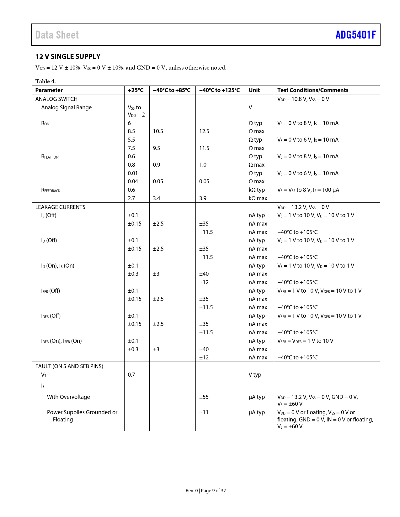 Data Sheet. ADG5401F. 12 V SINGLE SUPPLY. Table 4. Parameter. +25°C. −40°C to +85°C. −40°C to +125°C. Unit. Test Conditions/Comments