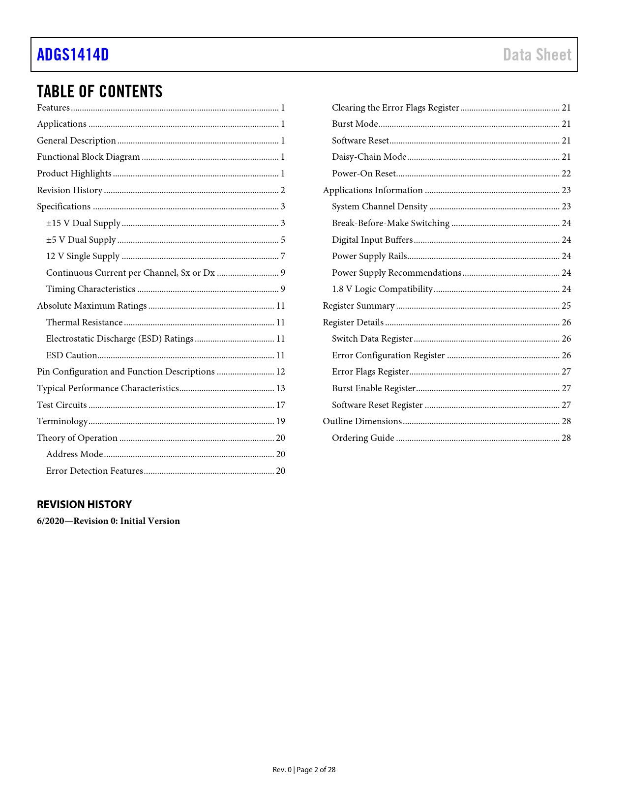 link to page 1 link to page 1 link to page 1 link to page 1 link to page 1 link to page 2 link to page 3 link to page 3 link to page 5 link to page 7 link to page 9 link to page 9 link to page 11 link to page 11 link to page 11 link to page 11 link to page 12 link to page 13 link to page 17 link to page 19 link to page 20 link to page 20 link to page 20 link to page 21 link to page 21 link to page 21 link to page 21 link to page 22 link to page 23 link to page 23 link to page 24 link to page 24 link to page 24 link to page 24 link to page 24 link to page 25 link to page 26 link to page 26 link to page 26 link to page 27 link to page 27 link to page 27 link to page 28 link to page 28 ADGS1414DData SheetTABLE OF CONTENTS Features .. 1 Clearing the Error Flags Register ... 21 Applications .. 1 Burst Mode .. 21 General Description ... 1 Software Reset ... 21 Functional Block Diagram .. 1 Daisy-Chain Mode ... 21 Product Highlights ... 1 Power-On Reset .. 22 Revision History ... 2 Applications Information ... 23 Specifications .. 3 System Channel Density ... 23 ±15 V Dual Supply ... 3 Break-Before-Make Switching ... 24 ±5 V Dual Supply ... 5 Digital Input Buffers .. 24 12 V Single Supply ... 7 Power Supply Rails ... 24 Continuous Current per Channel, Sx or Dx .. 9 Power Supply Recommendations .. 24 Timing Characteristics .. 9 1.8 V Logic Compatibility ... 24 Absolute Maximum Ratings ... 11 Register Summary .. 25 Thermal Resistance .. 11 Register Details ... 26 Electrostatic Discharge (ESD) Ratings .. 11 Switch Data Register .. 26 ESD Caution.. 11 Error Configuration Register ... 26 Pin Configuration and Function Descriptions .. 12 Error Flags Register .. 27 Typical Performance Characteristics ... 13 Burst Enable Register ... 27 Test Circuits .. 17 Software Reset Register ... 27 Terminology .. 19 Outline Dimensions ... 28 Theory of Operation .. 20 Ordering Guide .. 28 Address Mode ... 20 Error Detection Features ... 20 REVISION HISTORY 6/2020—Revision 0: Initial Version Rev. 0 | Page 2 of 28 Document Outline Features Applications General Description Functional Block Diagram Product Highlights Revision History Specifications ±15 V Dual Supply ±5 V Dual Supply 12 V Single Supply Continuous Current per Channel, Sx or Dx Timing Characteristics Timing Diagrams Absolute Maximum Ratings Thermal Resistance Electrostatic Discharge (ESD) Ratings ESD Ratings for ADGS1414D ESD Caution Pin Configuration and Function Descriptions Typical Performance Characteristics Test Circuits Terminology Theory of Operation Address Mode Error Detection Features Cyclic Redundancy Check (CRC) Error Detection SCLK Count Error Detection Invalid Read and Write Address Error Clearing the Error Flags Register Burst Mode Software Reset Daisy-Chain Mode Power-On Reset Applications Information System Channel Density Route Through Pins Integrated Passive Components Break-Before-Make Switching Digital Input Buffers Power Supply Rails Power Supply Recommendations 1.8 V Logic Compatibility Register Summary Register Details Switch Data Register Error Configuration Register Error Flags Register Burst Enable Register Software Reset Register Outline Dimensions Ordering Guide