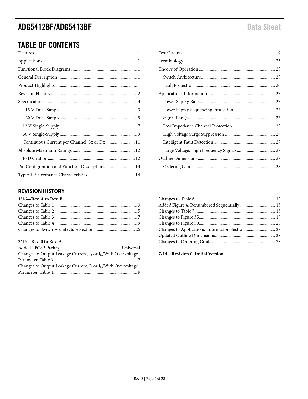 ADG5412BF/ADG5413BF Data Sheet TABLE OF CONTENTS REVISION HISTORY 1/16—Rev A to Rev B 3/15—Rev 0 to Rev A