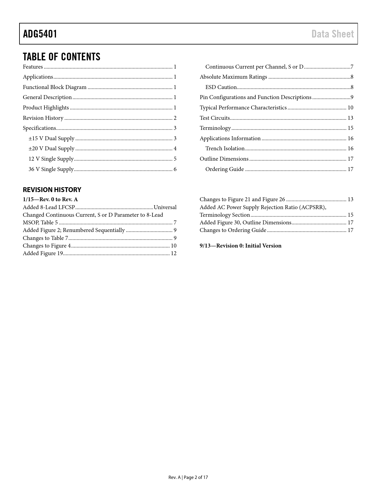 link to page 1 link to page 1 link to page 1 link to page 1 link to page 1 link to page 2 link to page 3 link to page 3 link to page 4 link to page 5 link to page 6 link to page 7 link to page 8 link to page 8 link to page 9 link to page 10 link to page 13 link to page 15 link to page 16 link to page 16 link to page 17 link to page 17 ADG5401Data SheetTABLE OF CONTENTS Features .. 1 Continuous Current per Channel, S or D ..7 Applications ... 1 Absolute Maximum Ratings ..8 Functional Block Diagram .. 1 ESD Caution...8 General Description ... 1 Pin Configurations and Function Descriptions ..9 Product Highlights ... 1 Typical Performance Characteristics ... 10 Revision History ... 2 Test Circuits ... 13 Specifications ... 3 Terminology .. 15 ±15 V Dual Supply ... 3 Applications Information .. 16 ±20 V Dual Supply ... 4 Trench Isolation .. 16 12 V Single Supply .. 5 Outline Dimensions ... 17 36 V Single Supply .. 6 Ordering Guide .. 17 REVISION HISTORY 1/15—Rev. 0 to Rev. A Changes to Figure 21 and Figure 26 .. 13 Added 8-Lead LFCSP ... Universal Added AC Power Supply Rejection Ratio (ACPSRR), Changed Continuous Current, S or D Parameter to 8-Lead Terminology Section .. 15 MSOP, Table 5 ... 7 Added Figure 30, Outline Dimensions .. 17 Added Figure 2; Renumbered Sequentially .. 9 Changes to Ordering Guide .. 17 Changes to Table 7 .. 9 Changes to Figure 4 .. 10 9/13—Revision 0: Initial Version Added Figure 19.. 12 Rev. A | Page 2 of 17 Document Outline FEATURES APPLICATIONS FUNCTIONAL BLOCK DIAGRAM GENERAL DESCRIPTION PRODUCT HIGHLIGHTS TABLE OF CONTENTS REVISION HISTORY SPECIFICATIONS ±15 V DUAL SUPPLY ±20 V DUAL SUPPLY 12 V SINGLE SUPPLY 36 V SINGLE SUPPLY CONTINUOUS CURRENT PER CHANNEL, S OR D ABSOLUTE MAXIMUM RATINGS ESD CAUTION PIN CONFIGURATIONS AND FUNCTION DESCRIPTIONS TYPICAL PERFORMANCE CHARACTERISTICS TEST CIRCUITS TERMINOLOGY APPLICATIONS INFORMATION TRENCH ISOLATION OUTLINE DIMENSIONS ORDERING GUIDE