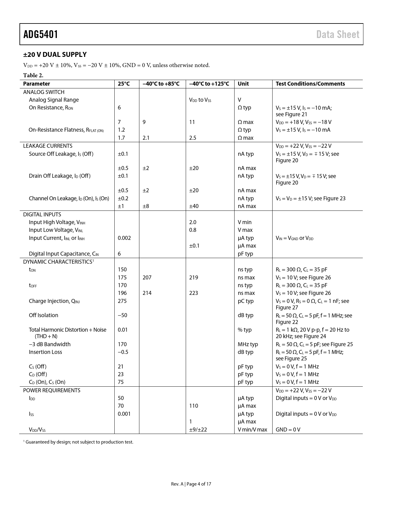ADG5401. Data Sheet. ±20 V DUAL SUPPLY. Table 2. Parameter. 25°C. −40°C to +85°C. −40°C to +125°C. Unit. Test Conditions/Comments