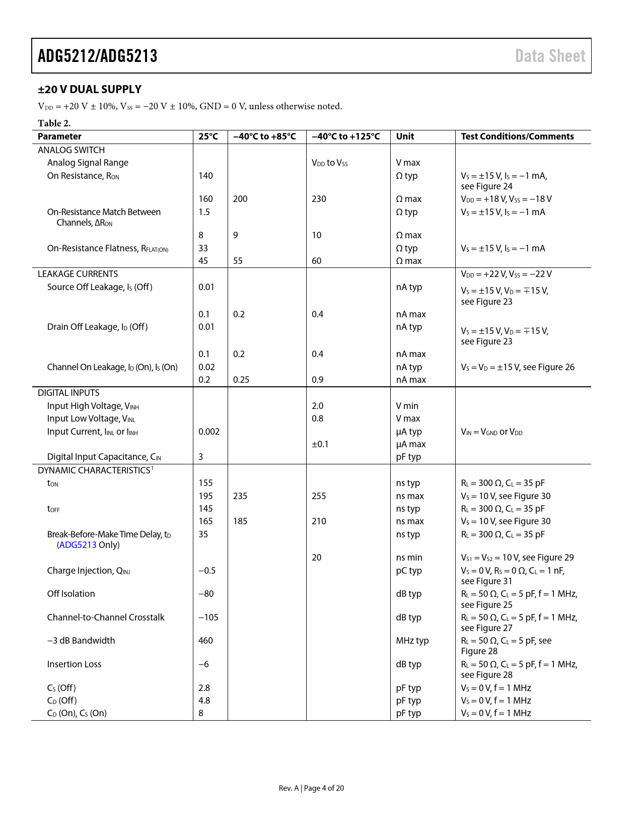 ADG5212/ADG5213. Data Sheet. ±20 V DUAL SUPPLY. Table 2. Parameter. 25°C. −40°C to +85°C. −40°C to +125°C. Unit