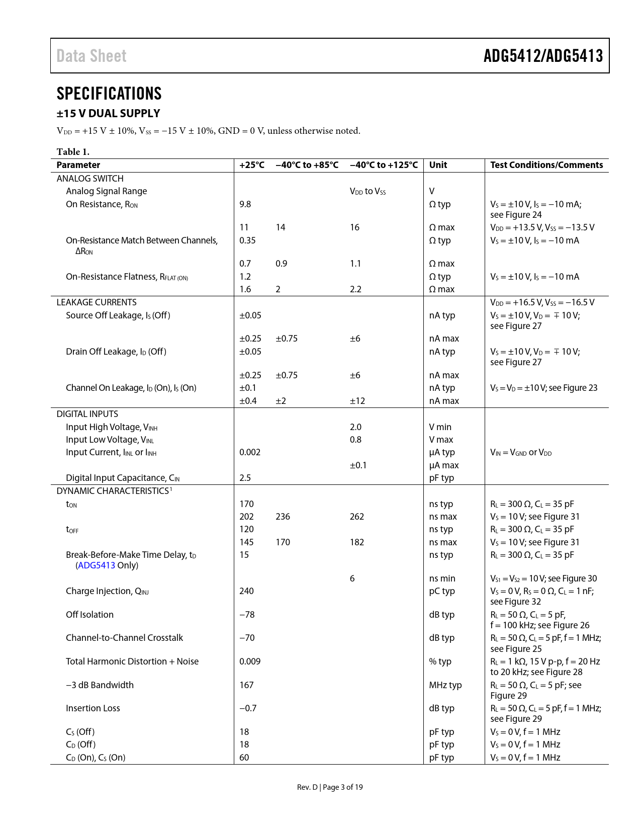 link to page 14 link to page 14 link to page 14 link to page 14 link to page 15 link to page 15 link to page 15 link to page 15 link to page 14 link to page 14 link to page 14 link to page 14 link to page 14 link to page 4 Data SheetADG5412/ADG5413SPECIFICATIONS ±15 V DUAL SUPPLY VDD = +15 V ± 10%, VSS = −15 V ± 10%, GND = 0 V, unless otherwise noted. Table 1. Parameter+25°C −40°C to +85°C −40°C to +125°C UnitTest Conditions/Comments ANALOG SWITCH Analog Signal Range VDD to VSS V On Resistance, RON 9.8 Ω typ VS = ±10 V, IS = −10 mA; see Figure 24 11 14 16 Ω max VDD = +13.5 V, VSS = −13.5 V On-Resistance Match Between Channels, 0.35 Ω typ VS = ±10 V, IS = −10 mA ∆RON 0.7 0.9 1.1 Ω max On-Resistance Flatness, RFLAT (ON) 1.2 Ω typ VS = ±10 V, IS = −10 mA 1.6 2 2.2 Ω max LEAKAGE CURRENTS VDD = +16.5 V, VSS = −16.5 V Source Off Leakage, IS (Off) ±0.05 nA typ VS = ±10 V, VD = 10 V; see Figure 27 ±0.25 ±0.75 ±6 nA max Drain Off Leakage, ID (Off) ±0.05 nA typ VS = ±10 V, VD = 10 V; see Figure 27 ±0.25 ±0.75 ±6 nA max Channel On Leakage, ID (On), IS (On) ±0.1 nA typ VS = VD = ±10 V; see Figure 23 ±0.4 ±2 ±12 nA max DIGITAL INPUTS Input High Voltage, VINH 2.0 V min Input Low Voltage, VINL 0.8 V max Input Current, IINL or IINH 0.002 µA typ VIN = VGND or VDD ±0.1 µA max Digital Input Capacitance, CIN 2.5 pF typ DYNAMIC CHARACTERISTICS1 tON 170 ns typ RL = 300 Ω, CL = 35 pF 202 236 262 ns max VS = 10 V; see Figure 31 tOFF 120 ns typ RL = 300 Ω, CL = 35 pF 145 170 182 ns max VS = 10 V; see Figure 31 Break-Before-Make Time Delay, tD 15 ns typ RL = 300 Ω, CL = 35 pF (ADG5413 Only) 6 ns min VS1 = VS2 = 10 V; see Figure 30 Charge Injection, QINJ 240 pC typ VS = 0 V, RS = 0 Ω, CL = 1 nF; see Figure 32 Off Isolation −78 dB typ RL = 50 Ω, CL = 5 pF, f = 100 kHz; see Figure 26 Channel-to-Channel Crosstalk −70 dB typ RL = 50 Ω, CL = 5 pF, f = 1 MHz; see Figure 25 Total Harmonic Distortion + Noise 0.009 % typ RL = 1 kΩ, 15 V p-p, f = 20 Hz to 20 kHz; see Figure 28 −3 dB Bandwidth 167 MHz typ RL = 50 Ω, CL = 5 pF; see Figure 29 Insertion Loss −0.7 dB typ RL = 50 Ω, CL = 5 pF, f = 1 MHz; see Figure 29 CS (Off) 18 pF typ VS = 0 V, f = 1 MHz CD (Off) 18 pF typ VS = 0 V, f = 1 MHz CD (On), CS (On) 60 pF typ VS = 0 V, f = 1 MHz Rev. D | Page 3 of 19 Document Outline FEATURES APPLICATIONS FUNCTIONAL BLOCK DIAGRAMS GENERAL DESCRIPTION PRODUCT HIGHLIGHTS REVISION HISTORY SPECIFICATIONS ±15 V DUAL SUPPLY ±20 V DUAL SUPPLY 12 V SINGLE SUPPLY 36 V SINGLE SUPPLY CONTINUOUS CURRENT PER CHANNEL, Sx OR Dx ABSOLUTE MAXIMUM RATINGS ESD CAUTION PIN CONFIGURATIONS AND FUNCTION DESCRIPTIONS TYPICAL PERFORMANCE CHARACTERISTICS TEST CIRCUITS TERMINOLOGY TRENCH ISOLATION APPLICATIONS INFORMATION OUTLINE DIMENSIONS ORDERING GUIDE