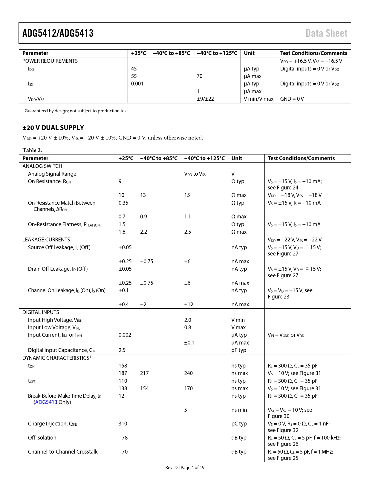 link to page 14 link to page 14 link to page 14 link to page 14 link to page 15 link to page 15 link to page 15 link to page 15 link to page 14 link to page 14 link to page 5 ADG5412/ADG5413Data SheetParameter+25°C −40°C to +85°C −40°C to +125°C UnitTest Conditions/Comments POWER REQUIREMENTS VDD = +16.5 V, VSS = −16.5 V IDD 45 µA typ Digital inputs = 0 V or VDD 55 70 µA max ISS 0.001 µA typ Digital inputs = 0 V or VDD 1 µA max VDD/VSS ±9/±22 V min/V max GND = 0 V 1 Guaranteed by design; not subject to production test. ±20 V DUAL SUPPLY VDD = +20 V ± 10%, VSS = −20 V ± 10%, GND = 0 V, unless otherwise noted. Table 2. Parameter+25°C −40°C to +85°C −40°C to +125°C UnitTest Conditions/Comments ANALOG SWITCH Analog Signal Range VDD to VSS V On Resistance, RON 9 Ω typ VS = ±15 V, IS = −10 mA; see Figure 24 10 13 15 Ω max VDD = +18 V, VSS = −18 V On-Resistance Match Between 0.35 Ω typ VS = ±15 V, IS = −10 mA Channels, ∆RON 0.7 0.9 1.1 Ω max On-Resistance Flatness, RFLAT (ON) 1.5 Ω typ VS = ±15 V, IS = −10 mA 1.8 2.2 2.5 Ω max LEAKAGE CURRENTS VDD = +22 V, VSS = −22 V Source Off Leakage, IS (Off) ±0.05 nA typ VS = ±15 V, VD = 15 V; see Figure 27 ±0.25 ±0.75 ±6 nA max Drain Off Leakage, ID (Off) ±0.05 nA typ VS = ±15 V, VD = 15 V; see Figure 27 ±0.25 ±0.75 ±6 nA max Channel On Leakage, ID (On), IS (On) ±0.1 nA typ VS = VD = ±15 V; see Figure 23 ±0.4 ±2 ±12 nA max DIGITAL INPUTS Input High Voltage, VINH 2.0 V min Input Low Voltage, VINL 0.8 V max Input Current, IINL or IINH 0.002 µA typ VIN = VGND or VDD ±0.1 µA max Digital Input Capacitance, CIN 2.5 pF typ DYNAMIC CHARACTERISTICS1 tON 158 ns typ RL = 300 Ω, CL = 35 pF 187 217 240 ns max VS = 10 V; see Figure 31 tOFF 110 ns typ RL = 300 Ω, CL = 35 pF 138 154 170 ns max VS = 10 V; see Figure 31 Break-Before-Make Time Delay, tD 12 ns typ RL = 300 Ω, CL = 35 pF (ADG5413 Only) 5 ns min VS1 = VS2 = 10 V; see Figure 30 Charge Injection, QINJ 310 pC typ VS = 0 V, RS = 0 Ω, CL = 1 nF; see Figure 32 Off Isolation −78 dB typ RL = 50 Ω, CL = 5 pF, f = 100 kHz; see Figure 26 Channel-to-Channel Crosstalk −70 dB typ RL = 50 Ω, CL = 5 pF, f = 1 MHz; see Figure 25 Rev. D | Page 4 of 19 Document Outline FEATURES APPLICATIONS FUNCTIONAL BLOCK DIAGRAMS GENERAL DESCRIPTION PRODUCT HIGHLIGHTS REVISION HISTORY SPECIFICATIONS ±15 V DUAL SUPPLY ±20 V DUAL SUPPLY 12 V SINGLE SUPPLY 36 V SINGLE SUPPLY CONTINUOUS CURRENT PER CHANNEL, Sx OR Dx ABSOLUTE MAXIMUM RATINGS ESD CAUTION PIN CONFIGURATIONS AND FUNCTION DESCRIPTIONS TYPICAL PERFORMANCE CHARACTERISTICS TEST CIRCUITS TERMINOLOGY TRENCH ISOLATION APPLICATIONS INFORMATION OUTLINE DIMENSIONS ORDERING GUIDE