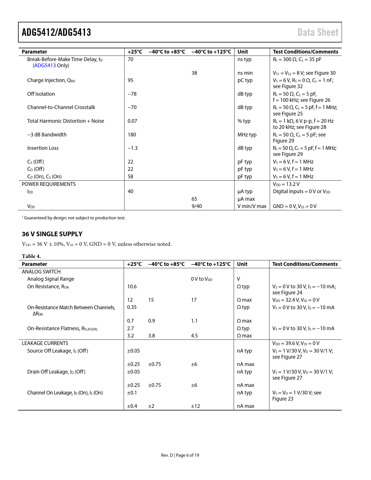 link to page 15 link to page 15 link to page 14 link to page 14 link to page 14 link to page 14 link to page 14 link to page 14 link to page 14 link to page 14 link to page 14 ADG5412/ADG5413Data SheetParameter+25°C −40°C to +85°C −40°C to +125°C UnitTest Conditions/Comments Break-Before-Make Time Delay, tD 70 ns typ RL = 300 Ω, CL = 35 pF (ADG5413 Only) 38 ns min VS1 = VS2 = 8 V; see Figure 30 Charge Injection, QINJ 95 pC typ VS = 6 V, RS = 0 Ω, CL = 1 nF; see Figure 32 Off Isolation −78 dB typ RL = 50 Ω, CL = 5 pF, f = 100 kHz; see Figure 26 Channel-to-Channel Crosstalk −70 dB typ RL = 50 Ω, CL = 5 pF, f = 1 MHz; see Figure 25 Total Harmonic Distortion + Noise 0.07 % typ RL = 1 kΩ, 6 V p-p, f = 20 Hz to 20 kHz; see Figure 28 −3 dB Bandwidth 180 MHz typ RL = 50 Ω, CL = 5 pF; see Figure 29 Insertion Loss −1.3 dB typ RL = 50 Ω, CL = 5 pF, f = 1 MHz; see Figure 29 CS (Off) 22 pF typ VS = 6 V, f = 1 MHz CD (Off) 22 pF typ VS = 6 V, f = 1 MHz CD (On), CS (On) 58 pF typ VS = 6 V, f = 1 MHz POWER REQUIREMENTS VDD = 13.2 V IDD 40 µA typ Digital inputs = 0 V or VDD 65 µA max VDD 9/40 V min/V max GND = 0 V, VSS = 0 V 1 Guaranteed by design; not subject to production test. 36 V SINGLE SUPPLY VDD = 36 V ± 10%, VSS = 0 V, GND = 0 V, unless otherwise noted. Table 4. Parameter+25°C −40°C to +85°C −40°C to +125°C UnitTest Conditions/Comments ANALOG SWITCH Analog Signal Range 0 V to VDD V On Resistance, RON 10.6 Ω typ VS = 0 V to 30 V, IS = −10 mA; see Figure 24 12 15 17 Ω max VDD = 32.4 V, VSS = 0 V On-Resistance Match Between Channels, 0.35 Ω typ VS = 0 V to 30 V, IS = −10 mA ∆RON 0.7 0.9 1.1 Ω max On-Resistance Flatness, RFLAT(ON) 2.7 Ω typ VS = 0 V to 30 V, IS = −10 mA 3.2 3.8 4.5 Ω max LEAKAGE CURRENTS VDD = 39.6 V, VSS = 0 V Source Off Leakage, IS (Off) ±0.05 nA typ VS = 1 V/30 V, VD = 30 V/1 V; see Figure 27 ±0.25 ±0.75 ±6 nA max Drain Off Leakage, ID (Off) ±0.05 nA typ VS = 1 V/30 V, VD = 30 V/1 V; see Figure 27 ±0.25 ±0.75 ±6 nA max Channel On Leakage, ID (On), IS (On) ±0.1 nA typ VS = VD = 1 V/30 V; see Figure 23 ±0.4 ±2 ±12 nA max Rev. D | Page 6 of 19 Document Outline FEATURES APPLICATIONS FUNCTIONAL BLOCK DIAGRAMS GENERAL DESCRIPTION PRODUCT HIGHLIGHTS REVISION HISTORY SPECIFICATIONS ±15 V DUAL SUPPLY ±20 V DUAL SUPPLY 12 V SINGLE SUPPLY 36 V SINGLE SUPPLY CONTINUOUS CURRENT PER CHANNEL, Sx OR Dx ABSOLUTE MAXIMUM RATINGS ESD CAUTION PIN CONFIGURATIONS AND FUNCTION DESCRIPTIONS TYPICAL PERFORMANCE CHARACTERISTICS TEST CIRCUITS TERMINOLOGY TRENCH ISOLATION APPLICATIONS INFORMATION OUTLINE DIMENSIONS ORDERING GUIDE
