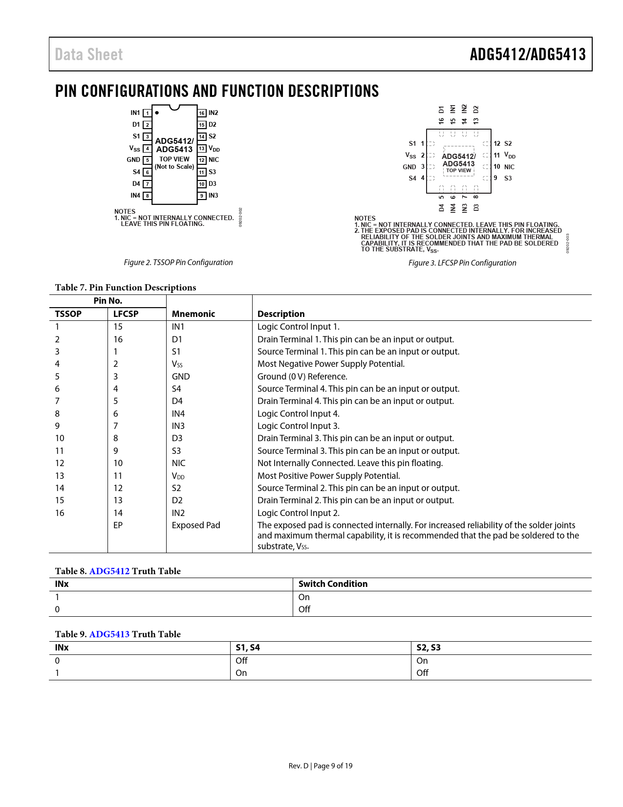 Data SheetADG5412/ADG5413PIN CONFIGURATIONS AND FUNCTION DESCRIPTIONS1122IN1NN116 IN2DIID6543D1 215 D21111S1 314 S2ADG5412/S1 112 S2VSS 413 VADG5413DDVSS 211 VADG5412/DDGND 5TOP VIEW12 NIC(Not to Scale)ADG5413GND 310 NICS4 611 S3TOP VIEWS4 49S3D4 710 D3IN4 89 IN356784433 2 NOTESDNINID 00 2- 1. NIC = NOT INTERNALLY CONNECTED.NOTES 20 LEAVE THIS PIN FLOATING. 09 1. NIC = NOT INTERNALLY CONNECTED. LEAVE THIS PIN FLOATING.2. THE EXPOSED PAD IS CONNECTED INTERNALLY. FOR INCREASED 3 RELIABILITY OF THE SOLDER JOINTS AND MAXIMUM THERMAL 00 2- CAPABILITY, IT IS RECOMMENDED THAT THE PAD BE SOLDEREDTO THE SUBSTRATE, V 920 SS. 0 Figure 2. TSSOP Pin Configuration Figure 3. LFCSP Pin Configuration Table 7. Pin Function DescriptionsPin No.TSSOPLFCSPMnemonicDescription 1 15 IN1 Logic Control Input 1. 2 16 D1 Drain Terminal 1. This pin can be an input or output. 3 1 S1 Source Terminal 1. This pin can be an input or output. 4 2 VSS Most Negative Power Supply Potential. 5 3 GND Ground (0 V) Reference. 6 4 S4 Source Terminal 4. This pin can be an input or output. 7 5 D4 Drain Terminal 4. This pin can be an input or output. 8 6 IN4 Logic Control Input 4. 9 7 IN3 Logic Control Input 3. 10 8 D3 Drain Terminal 3. This pin can be an input or output. 11 9 S3 Source Terminal 3. This pin can be an input or output. 12 10 NIC Not Internally Connected. Leave this pin floating. 13 11 VDD Most Positive Power Supply Potential. 14 12 S2 Source Terminal 2. This pin can be an input or output. 15 13 D2 Drain Terminal 2. This pin can be an input or output. 16 14 IN2 Logic Control Input 2. EP Exposed Pad The exposed pad is connected internally. For increased reliability of the solder joints and maximum thermal capability, it is recommended that the pad be soldered to the substrate, VSS. Table 8. ADG5412 TruthTable INxSwitch Condition 1 On 0 Off Table 9. ADG5413 TruthTable INxS1, S4S2, S3 0 Off On 1 On Off Rev. D | Page 9 of 19 Document Outline FEATURES APPLICATIONS FUNCTIONAL BLOCK DIAGRAMS GENERAL DESCRIPTION PRODUCT HIGHLIGHTS REVISION HISTORY SPECIFICATIONS ±15 V DUAL SUPPLY ±20 V DUAL SUPPLY 12 V SINGLE SUPPLY 36 V SINGLE SUPPLY CONTINUOUS CURRENT PER CHANNEL, Sx OR Dx ABSOLUTE MAXIMUM RATINGS ESD CAUTION PIN CONFIGURATIONS AND FUNCTION DESCRIPTIONS TYPICAL PERFORMANCE CHARACTERISTICS TEST CIRCUITS TERMINOLOGY TRENCH ISOLATION APPLICATIONS INFORMATION OUTLINE DIMENSIONS ORDERING GUIDE