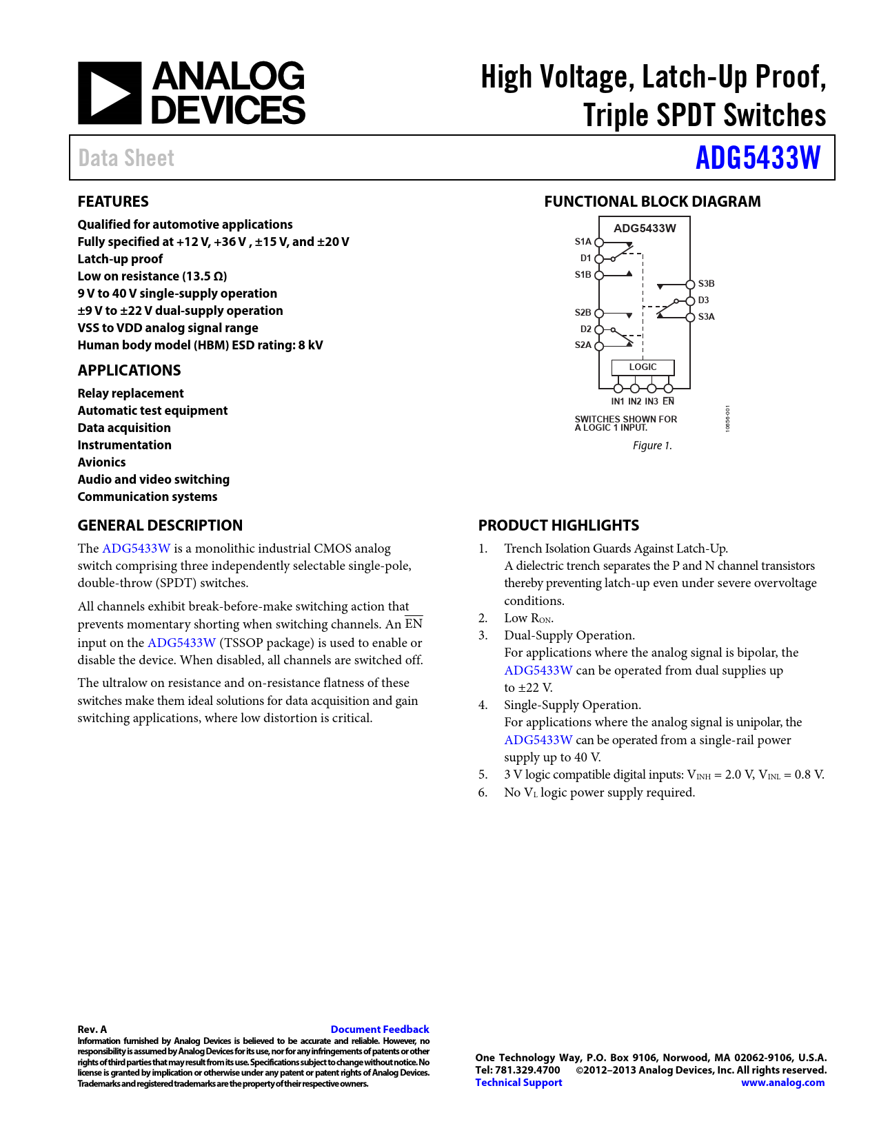 High Voltage, Latch-Up Proof,. Triple SPDT Switches. Data Sheet. ADG5433W. FEATURES. FUNCTIONAL BLOCK DIAGRAM