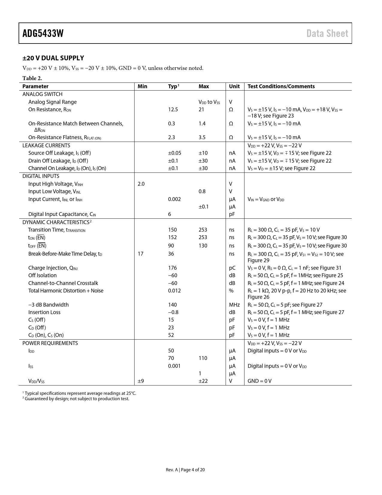 ADG5433W. Data Sheet. ±20 V DUAL SUPPLY. Table 2. Parameter. Min. Typ1. Max. Unit. Test Conditions/Comments