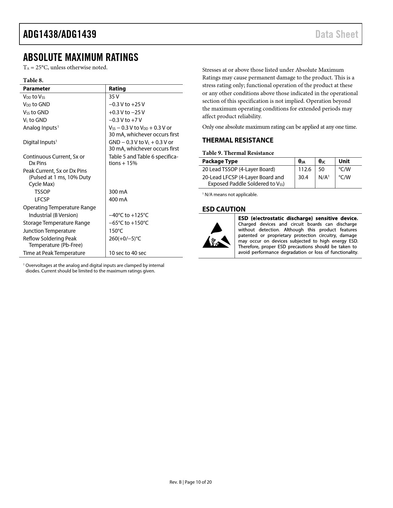 ADG1438/ADG1439. Data Sheet. ABSOLUTE MAXIMUM RATINGS. Table 8. Parameter. Rating. THERMAL RESISTANCE. Table 9. Thermal Resistance