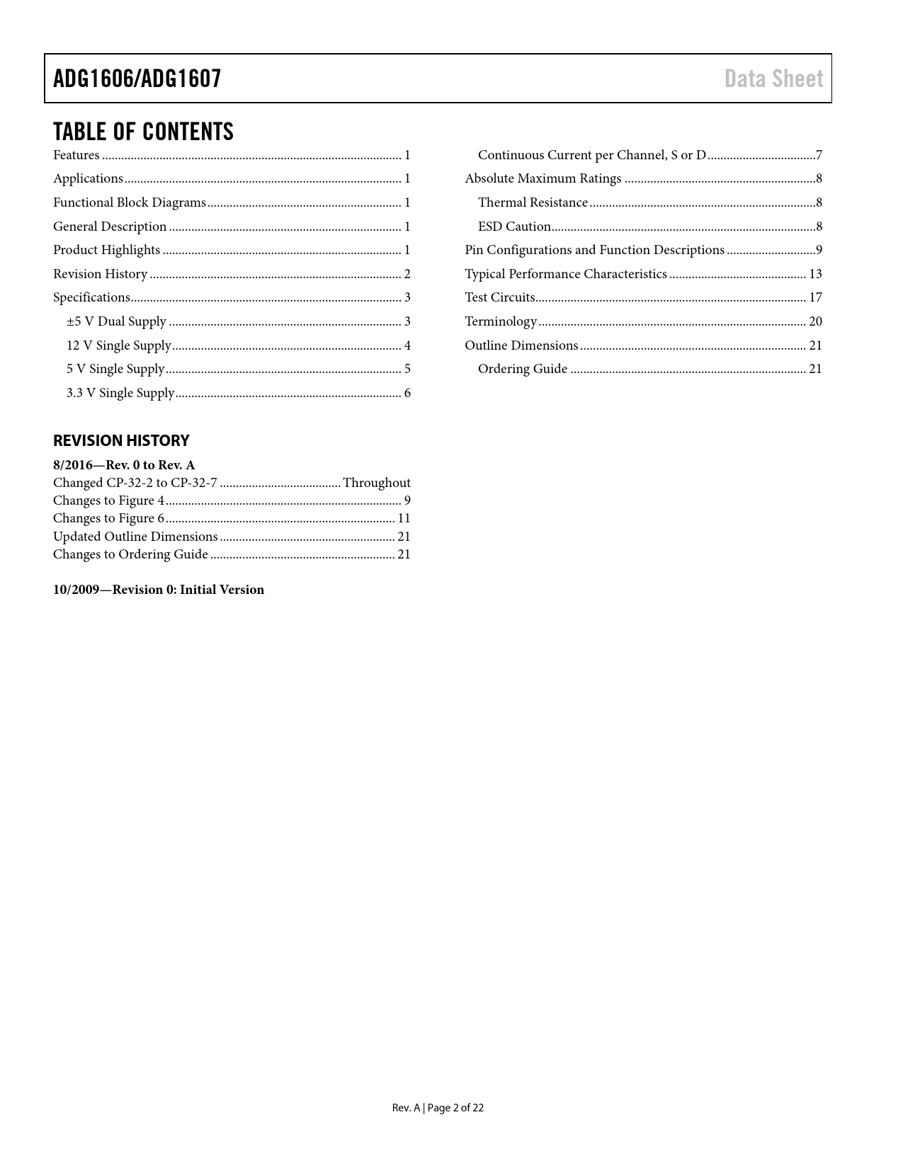 link to page 1 link to page 1 link to page 1 link to page 1 link to page 1 link to page 2 link to page 3 link to page 3 link to page 4 link to page 5 link to page 6 link to page 7 link to page 8 link to page 8 link to page 8 link to page 9 link to page 13 link to page 17 link to page 20 link to page 21 link to page 21 ADG1606/ADG1607Data SheetTABLE OF CONTENTS Features .. 1 Continuous Current per Channel, S or D ..7 Applications ... 1 Absolute Maximum Ratings ..8 Functional Block Diagrams ... 1 Thermal Resistance ...8 General Description ... 1 ESD Caution...8 Product Highlights ... 1 Pin Configurations and Function Descriptions ..9 Revision History ... 2 Typical Performance Characteristics ... 13 Specifications ... 3 Test Circuits ... 17 ±5 V Dual Supply ... 3 Terminology .. 20 12 V Single Supply .. 4 Outline Dimensions ... 21 5 V Single Supply .. 5 Ordering Guide .. 21 3.3 V Single Supply ... 6 REVISION HISTORY 8/2016—Rev. 0 to Rev. A Changed CP-32-2 to CP-32-7 .. Throughout Changes to Figure 4 .. 9 Changes to Figure 6 .. 11 Updated Outline Dimensions ... 21 Changes to Ordering Guide .. 21 10/2009—Revision 0: Initial Version Rev. A | Page 2 of 22 Document Outline FEATURES APPLICATIONS FUNCTIONAL BLOCK DIAGRAMS GENERAL DESCRIPTION PRODUCT HIGHLIGHTS TABLE OF CONTENTS REVISION HISTORY SPECIFICATIONS ±5 V DUAL SUPPLY 12 V SINGLE SUPPLY 5 V SINGLE SUPPLY 3.3 V SINGLE SUPPLY CONTINUOUS CURRENT PER CHANNEL, S OR D ABSOLUTE MAXIMUM RATINGS THERMAL RESISTANCE ESD CAUTION PIN CONFIGURATIONS AND FUNCTION DESCRIPTIONS TYPICAL PERFORMANCE CHARACTERISTICS TEST CIRCUITS TERMINOLOGY OUTLINE DIMENSIONS ORDERING GUIDE