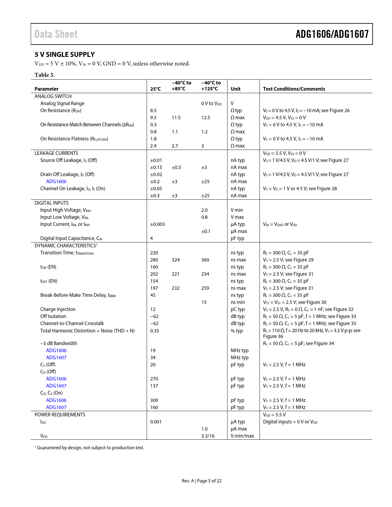 Data Sheet. ADG1606/ADG1607. 5 V SINGLE SUPPLY. Table 3. −40°C to. Parameter. 25°C. +85°C. +125°C. Unit. Test Conditions/Comments