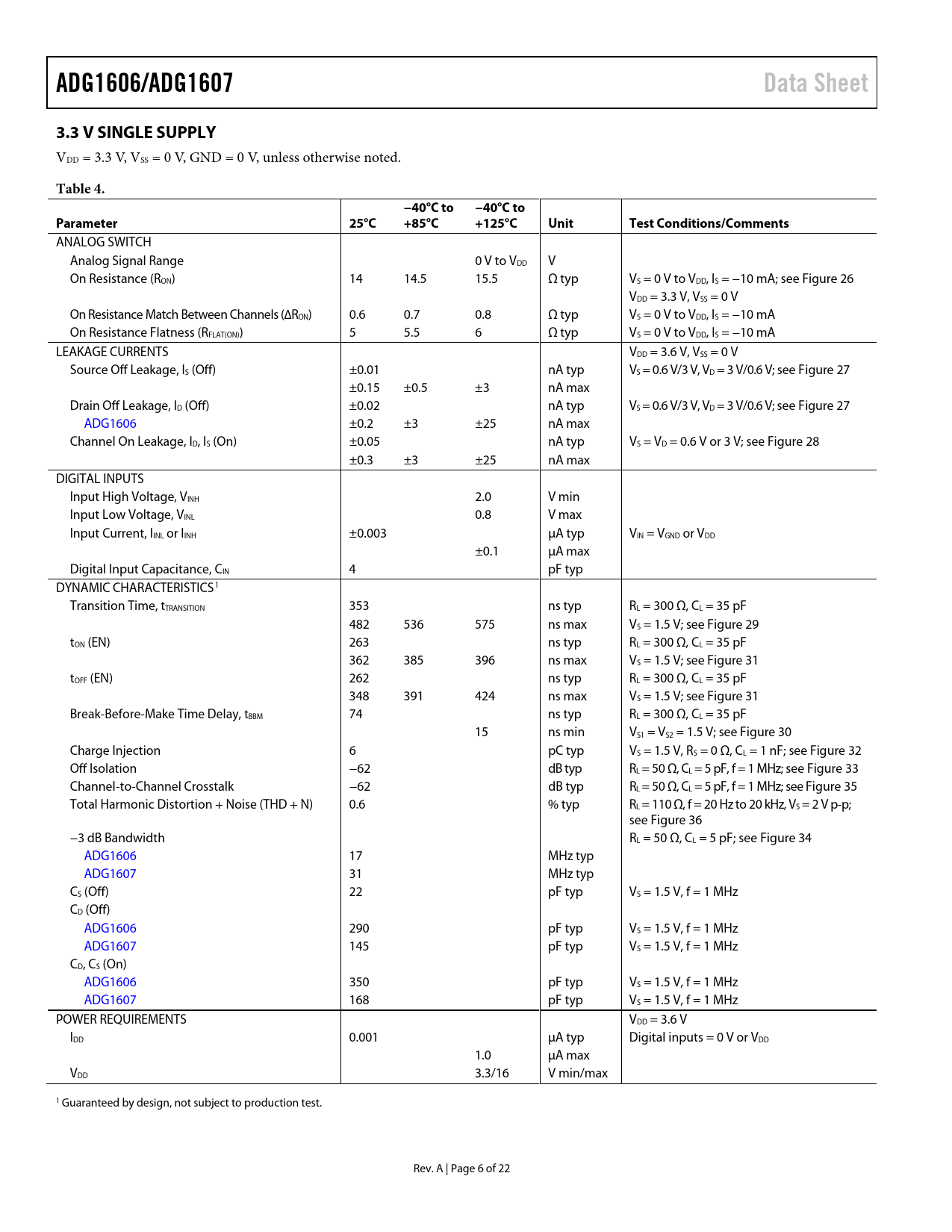 ADG1606/ADG1607. Data Sheet. 3.3 V SINGLE SUPPLY. Table 4. −40°C to. Parameter. 25°C. +85°C. +125°C. Unit. Test Conditions/Comments