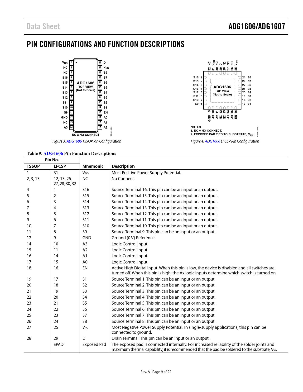 Table 9. ADG1606 P in Function Descriptions Pin No. TSSOP LFCSP Mnemonic Description