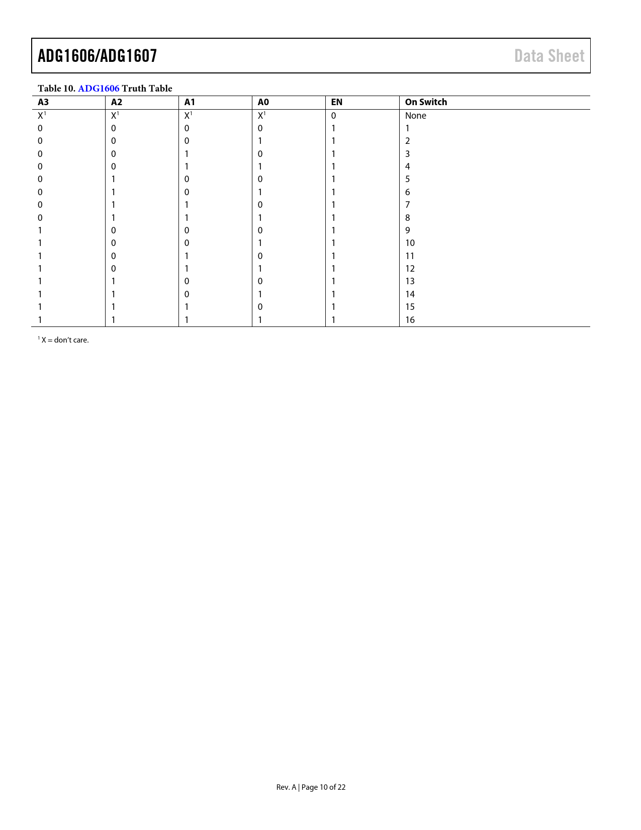 | Seiten / Seite | 22 / 10 — ADG1606/ADG1607. Data Sheet. Table 10. ADG1606 T. ruth Table A3. On Switch |