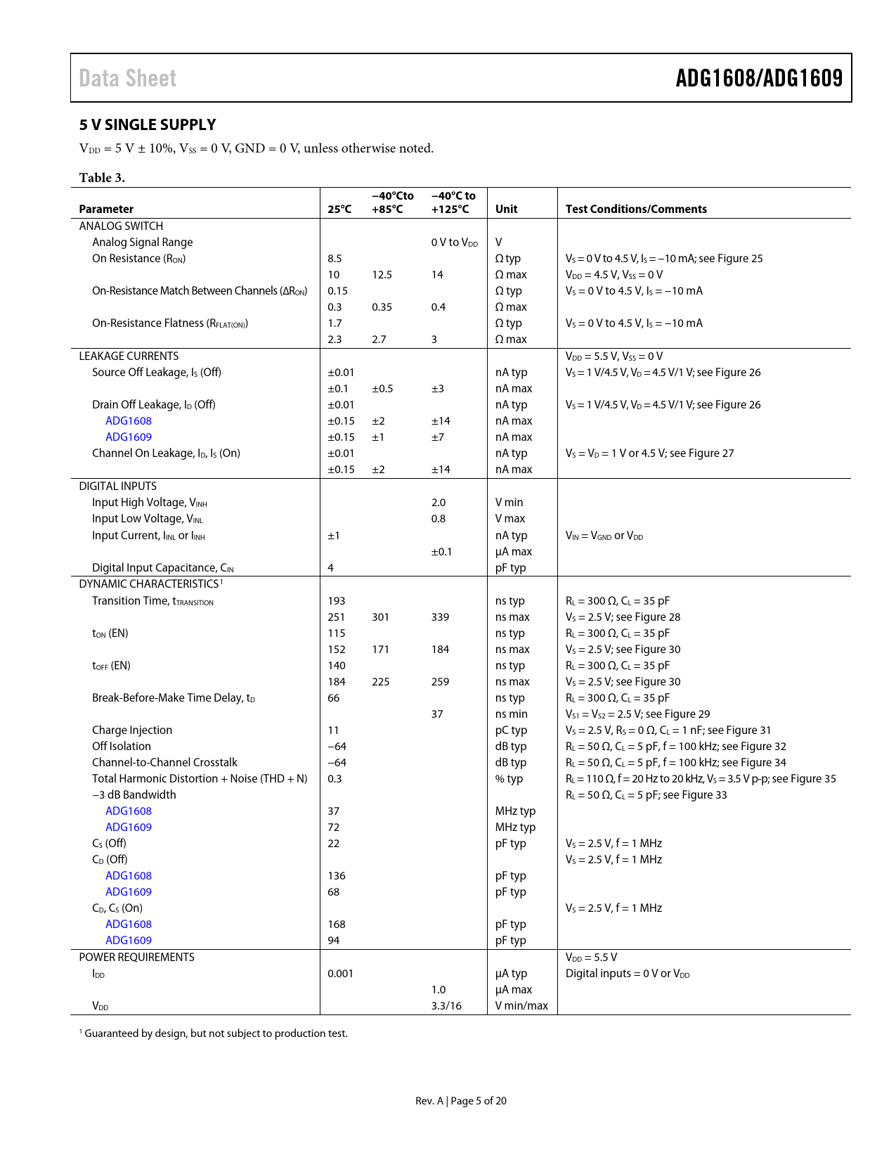 link to page 14 link to page 14 link to page 14 link to page 14 link to page 14 link to page 15 link to page 15 link to page 14 link to page 15 link to page 16 link to page 16 link to page 16 link to page 16 Data SheetADG1608/ADG16095 V SINGLE SUPPLY VDD = 5 V ± 10%, VSS = 0 V, GND = 0 V, unless otherwise noted. Table 3.−40°Cto−40°C toParameter25°C+85°C+125°CUnitTest Conditions/Comments ANALOG SWITCH Analog Signal Range 0 V to VDD V On Resistance (RON) 8.5 Ω typ VS = 0 V to 4.5 V, IS = −10 mA; see Figure 25 10 12.5 14 Ω max VDD = 4.5 V, VSS = 0 V On-Resistance Match Between Channels (∆RON) 0.15 Ω typ VS = 0 V to 4.5 V, IS = −10 mA 0.3 0.35 0.4 Ω max On-Resistance Flatness (RFLAT(ON)) 1.7 Ω typ VS = 0 V to 4.5 V, IS = −10 mA 2.3 2.7 3 Ω max LEAKAGE CURRENTS VDD = 5.5 V, VSS = 0 V Source Off Leakage, IS (Off) ±0.01 nA typ VS = 1 V/4.5 V, VD = 4.5 V/1 V; see Figure 26 ±0.1 ±0.5 ±3 nA max Drain Off Leakage, ID (Off) ±0.01 nA typ VS = 1 V/4.5 V, VD = 4.5 V/1 V; see Figure 26 ADG1608 ±0.15 ±2 ±14 nA max ADG1609 ±0.15 ±1 ±7 nA max Channel On Leakage, ID, IS (On) ±0.01 nA typ VS = VD = 1 V or 4.5 V; see Figure 27 ±0.15 ±2 ±14 nA max DIGITAL INPUTS Input High Voltage, VINH 2.0 V min Input Low Voltage, VINL 0.8 V max Input Current, IINL or IINH ±1 nA typ VIN = VGND or VDD ±0.1 µA max Digital Input Capacitance, CIN 4 pF typ DYNAMIC CHARACTERISTICS1 Transition Time, tTRANSITION 193 ns typ RL = 300 Ω, CL = 35 pF 251 301 339 ns max VS = 2.5 V; see Figure 28 tON (EN) 115 ns typ RL = 300 Ω, CL = 35 pF 152 171 184 ns max VS = 2.5 V; see Figure 30 tOFF (EN) 140 ns typ RL = 300 Ω, CL = 35 pF 184 225 259 ns max VS = 2.5 V; see Figure 30 Break-Before-Make Time Delay, tD 66 ns typ RL = 300 Ω, CL = 35 pF 37 ns min VS1 = VS2 = 2.5 V; see Figure 29 Charge Injection 11 pC typ VS = 2.5 V, RS = 0 Ω, CL = 1 nF; see Figure 31 Off Isolation −64 dB typ RL = 50 Ω, CL = 5 pF, f = 100 kHz; see Figure 32 Channel-to-Channel Crosstalk −64 dB typ RL = 50 Ω, CL = 5 pF, f = 100 kHz; see Figure 34 Total Harmonic Distortion + Noise (THD + N) 0.3 % typ RL = 110 Ω, f = 20 Hz to 20 kHz, VS = 3.5 V p-p; see Figure 35 −3 dB Bandwidth RL = 50 Ω, CL = 5 pF; see Figure 33 ADG1608 37 MHz typ ADG1609 72 MHz typ CS (Off) 22 pF typ VS = 2.5 V, f = 1 MHz CD (Off) VS = 2.5 V, f = 1 MHz ADG1608 136 pF typ ADG1609 68 pF typ CD, CS (On) VS = 2.5 V, f = 1 MHz ADG1608 168 pF typ ADG1609 94 pF typ POWER REQUIREMENTS VDD = 5.5 V IDD 0.001 µA typ Digital inputs = 0 V or VDD 1.0 µA max VDD 3.3/16 V min/max 1 Guaranteed by design, but not subject to production test. Rev. A | Page 5 of 20 Document Outline FEATURES APPLICATIONS FUNCTIONAL BLOCK DIAGRAMS GENERAL DESCRIPTION PRODUCT HIGHLIGHTS TABLE OF CONTENTS REVISION HISTORY SPECIFICATIONS ±5 V DUAL SUPPLY 12 V SINGLE SUPPLY 5 V SINGLE SUPPLY 3.3 V SINGLE SUPPLY CONTINUOUS CURRENT PER CHANNEL, S OR D ABSOLUTE MAXIMUM RATINGS ESD CAUTION PIN CONFIGURATIONS AND FUNCTION DESCRIPTIONS TYPICAL PERFORMANCE CHARACTERISTICS TEST CIRCUITS TERMINOLOGY OUTLINE DIMENSIONS ORDERING GUIDE