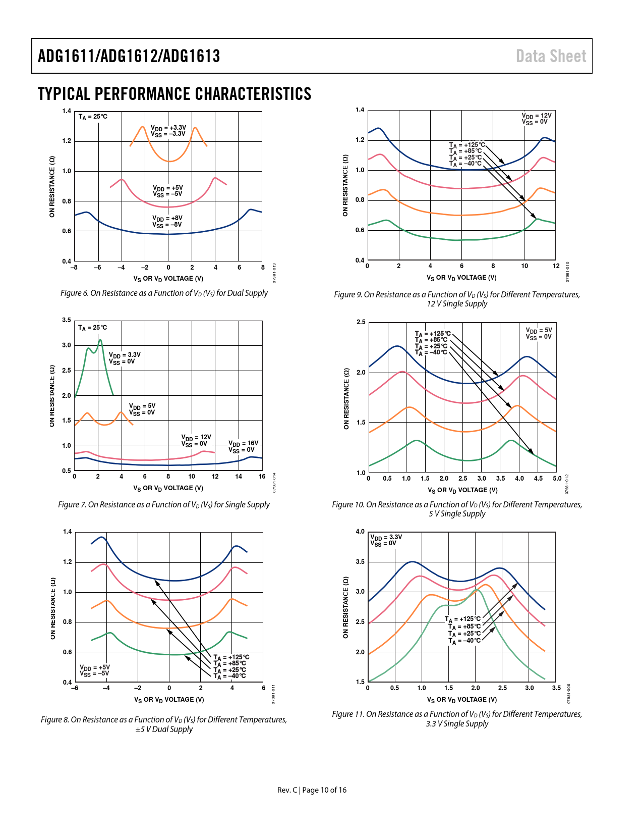 ADG1611/ADG1612/ADG1613Data SheetTYPICAL PERFORMANCE CHARACTERISTICS1.41.4TVA = 25°CDD = 12VVSS = 0VVDD = +3.3VVSS = –3.3V1.21.2TA = +125°C))TA = +85°CTA = +25°C(Ω(ΩTA = –40°C1.01.0ANCEANCETTVISDD = +5VISSVSS = –5VS0.80.8N REN REOOVDD = +8VVSS = –8V0.60.60.40.4–8–6–4–202468024681012 013 010 VVS OR VD VOLTAGE (V)S OR VD VOLTAGE (V) 07981- 07981- Figure 6. On Resistance as a Function of VD (VS) for Dual Supply Figure 9. On Resistance as a Function of VD (VS) for Different Temperatures, 12 V Single Supply 3.52.5TA = 25°CVTDD = 5VA = +125°CA = +125°VTSS = 0VA = +85°CA = +85°3.0TA = +25°CA = +25°VTA = –40°CA = –40°DD = 3.3V)VSS = 0V)2.5(Ω2.0(ΩANCET 2.0ANCETIS SVISDD = 5VSVSS = 0VN RE1.5ON RE1.5OVDD = 12V1.0VSS = 0VVDD = 16VVSS = 0V0.51.00246810121416 014 00.51.01.52.02.53.03.54.04.55.0 012 VS OR VD VOLTAGE (V) 07981- VS OR VD VOLTAGE (V) 07981- Figure 7. On Resistance as a Function of VD (VS) for Single Supply Figure 10. On Resistance as a Function of VD (VS) for Different Temperatures, 5 V Single Supply 1.44.0 VDD = 3.3VVSS = 0V1.23.5))(Ω(Ω1.03.0ANCEANCETTISISSST0.82.5A = +125°CTA = +85°CN REN RETOOA = +25°CTA = –40°C0.62.0TAT = +125°CA = +125°TAT = +85°CA = +85°VDD = +5VTAT = +25°CA = +25°VSS = –5VTAT = –40°CA = –40°0.41.5–6–4–20246 011 00.51.01.52.02.53.03.5 006 VS OR VD VOLTAGE (V)V 07981- S OR VD VOLTAGE (V) 07981- Figure 11. On Resistance as a Function of V Figure 8. On Resistance as a Function of V D (VS) for Different Temperatures, D (VS) for Different Temperatures, 3.3 V Single Supply ±5 V Dual Supply Rev. C | Page 10 of 16 Document Outline FEATURES APPLICATIONS GENERAL DESCRIPTION FUNCTIONAL BLOCK DIAGRAMS PRODUCT HIGHLIGHTS TABLE OF CONTENTS REVISION HISTORY SPECIFICATIONS ±5 V DUAL SUPPLY 12 V SINGLE SUPPLY 5 V SINGLE SUPPLY 3.3 V SINGLE SUPPLY CONTINUOUS CURRENT PER CHANNEL, S OR D ABSOLUTE MAXIMUM RATINGS ESD CAUTION PIN CONFIGURATIONS AND FUNCTION DESCRIPTIONS TYPICAL PERFORMANCE CHARACTERISTICS TEST CIRCUITS TERMINOLOGY OUTLINE DIMENSIONS ORDERING GUIDE