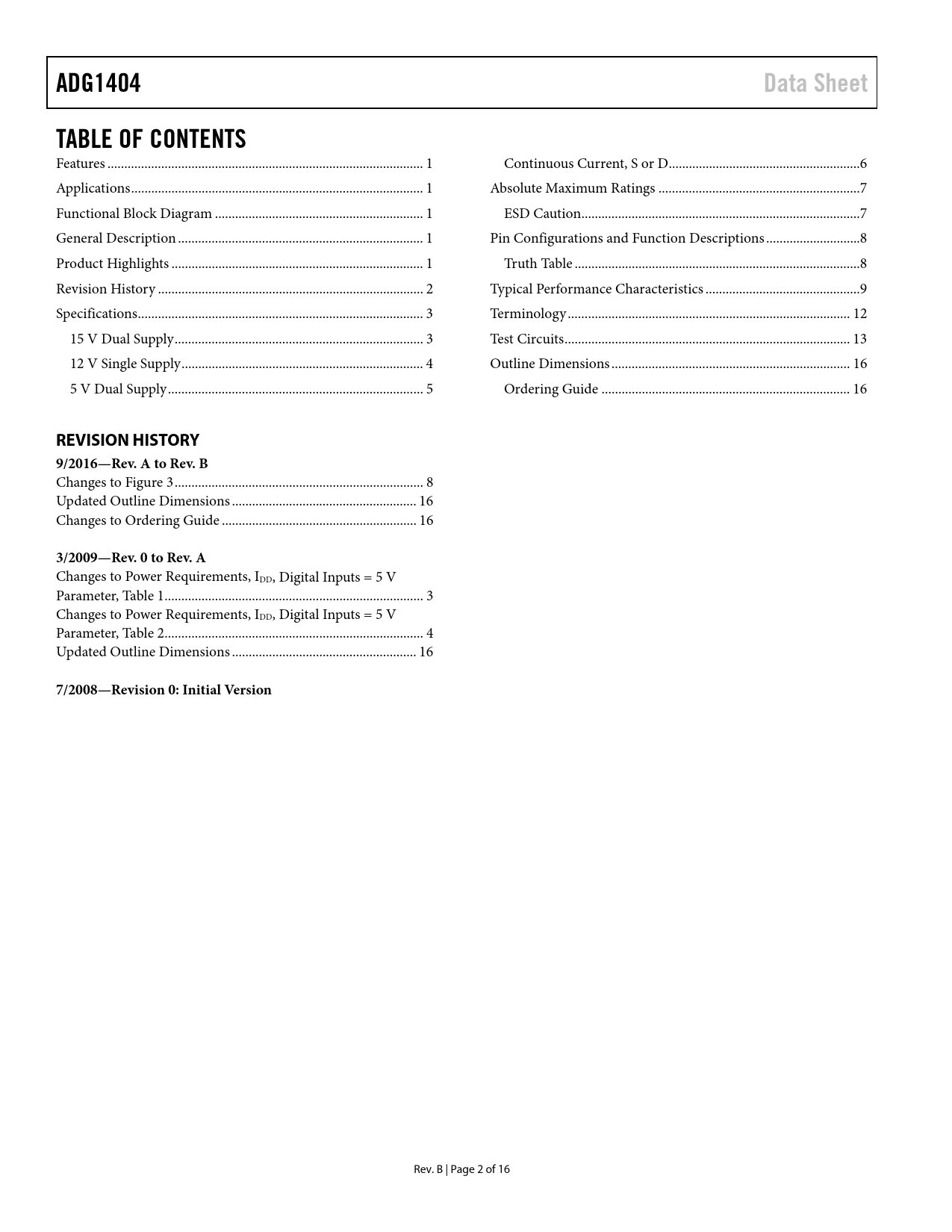 link to page 1 link to page 1 link to page 1 link to page 1 link to page 1 link to page 2 link to page 2 link to page 3 link to page 4 link to page 5 link to page 6 link to page 7 link to page 7 link to page 8 link to page 8 link to page 9 link to page 12 link to page 13 link to page 16 link to page 16 ADG1404Data SheetTABLE OF CONTENTS Features .. 1 Continuous Current, S or D ...6 Applications ... 1 Absolute Maximum Ratings ..7 Functional Block Diagram .. 1 ESD Caution...7 General Description ... 1 Pin Configurations and Function Descriptions ..8 Product Highlights ... 1 Truth Table ...8 Revision History ... 2 Typical Performance Characteristics ..9 Specifications ... 3 Terminology .. 12 15 V Dual Supply .. 3 Test Circuits ... 13 12 V Single Supply .. 4 Outline Dimensions ... 16 5 V Dual Supply .. 5 Ordering Guide .. 16 REVISION HISTORY9/2016—Rev. A to Rev. B Changes to Figure 3 .. 8 Updated Outline Dimensions ... 16 Changes to Ordering Guide .. 16 3/2009—Rev. 0 to Rev. A Changes to Power Requirements, IDD, Digital Inputs = 5 V Parameter, Table 1 ... 3 Changes to Power Requirements, IDD, Digital Inputs = 5 V Parameter, Table 2 ... 4 Updated Outline Dimensions ... 16 7/2008—Revision 0: Initial Version Rev. B | Page 2 of 16 Document Outline Features Applications Functional Block Diagram General Description Product Highlights Revision History Specifications 15 V Dual Supply 12 V Single Supply 5 V Dual Supply Continuous Current, S or D Absolute Maximum Ratings ESD Caution Pin Configurations and Function Descriptions Truth Table Typical Performance Characteristics Terminology Test Circuits Outline Dimensions Ordering Guide