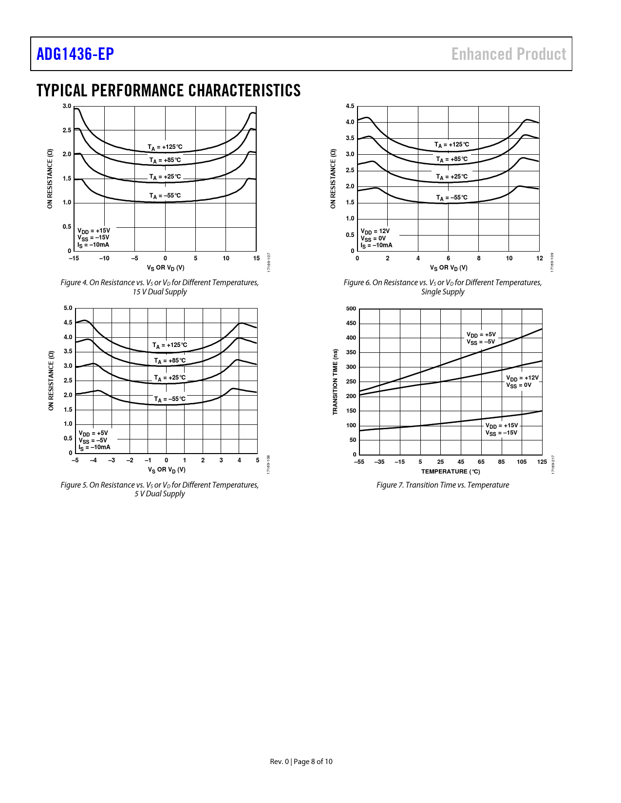 ADG1436-EPEnhanced ProductTYPICAL PERFORMANCE CHARACTERISTICS3.04.54.02.53.5)TTA = +125°CA = +125°C)2.0(Ω3.0(ΩTTA = +85°CA = +85°C2.51.5TA = +25°CTA = +25°CSISTANCE2.0SISTANCERETA = –55°CRETNA = –55°C1.0NO1.5O1.00.5VDD = +15VV0.5DD = 12VVSS = –15VVSS = 0VIS = –10mAIS = –10mA00–15–10–5051015 107 024681012 109 VS OR VD (V)V 17169- S OR VD (V) 17169- Figure 4. On Resistance vs. VS or VD for Different Temperatures, Figure 6. On Resistance vs. VS or VD for Different Temperatures, 15 V Dual Supply Single Supply 5.05004.54504.0V400DD = +5VVTSS = –5V)A = +125°C)3.5350(ΩnsT(A = +85°C3.0E300TIM2.5TA = +25°CV250DD = +12VVSISTANCESS = 0V2.0ITIONRES200TNA = –55°CNOA1.5150TR1.0100VDD = +15VVVDD = +5VSS = –15V0.5VSS = –5V50IS = –10mA00–5–4–3–2–1012345 108 –55–35–15525456585105125 217 VS OR VD (V) 17169- TEMPERATURE (°C) 17169- Figure 5. On Resistance vs. VS or VD for Different Temperatures, Figure 7. Transition Time vs. Temperature 5 V Dual Supply Rev. 0 | Page 8 of 10 Document Outline Features Applications Enhanced Product Features Functional Block Diagram General Description Revision History Specifications 15 V Dual Supply 12 V Single Supply 5 V Dual Supply Absolute Maximum Ratings Thermal Resistance ESD Caution Pin Configurations and Function Descriptions Truth Table For Switches Typical Performance Characteristics Outline Dimensions Ordering Guide