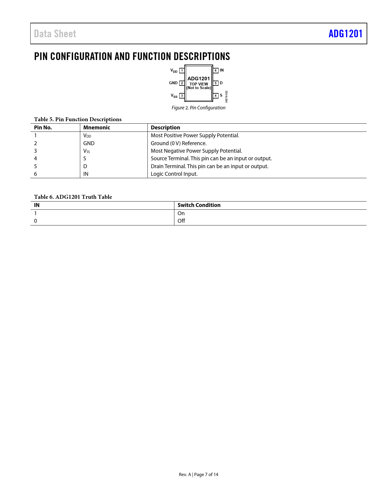 Data Sheet ADG1201 PIN CONFIGURATION AND FUNCTION DESCRIPTIONS VDD 1 6 IN ADG1201 GND 2 5 D TOP VIEW (Not to Scale)