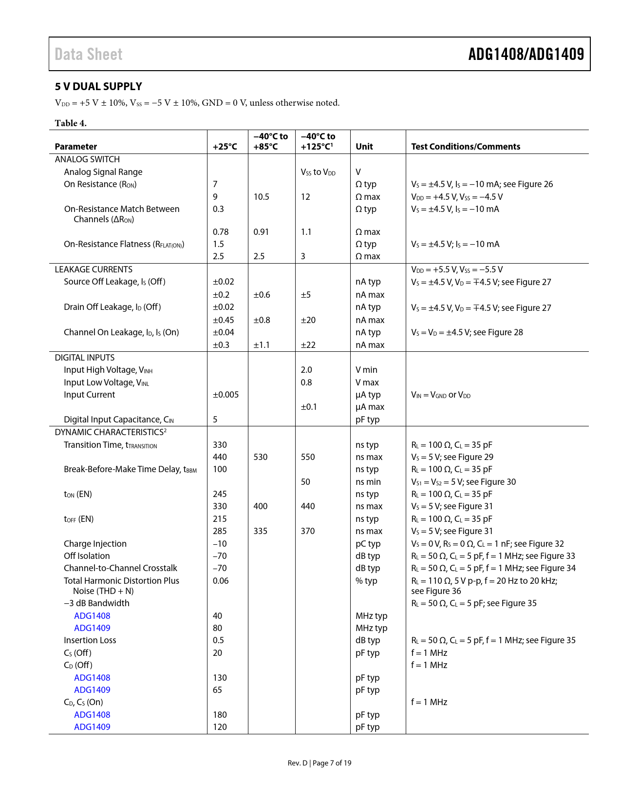 Data Sheet. ADG1408/ADG1409. 5 V DUAL SUPPLY. Table 4. −40°C to. Parameter +25°C. +85°C. +125°C1 Unit. Test. Conditions/Comments