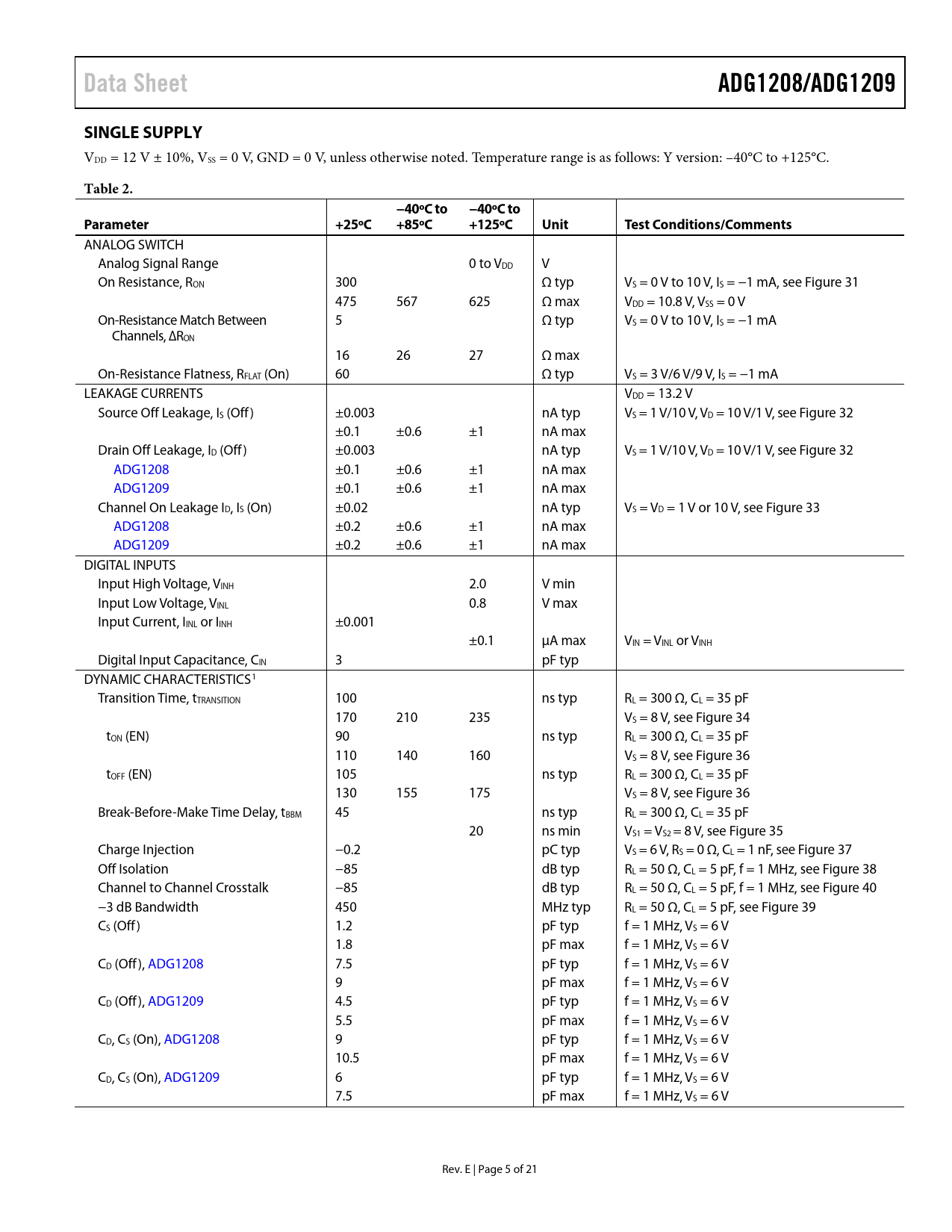 Data Sheet. ADG1208/ADG1209. SINGLE SUPPLY. Table 2. −40ºC to. Parameter. +25ºC. +85ºC. +125ºC. Unit. Test Conditions/Comments