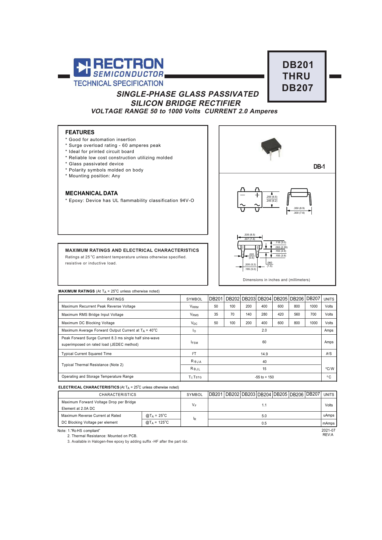 DB201THRUDB207SINGLE-PHASE GLASS PASSIVATEDSILICON BRIDGE RECTIFIERVOLTAGE RANGE 50 to 1000 Volts CURRENT 2.0 AmperesFEATURES * Good for automation insertion * Surge overload rating - 60 amperes peak * Ideal for printed circuit board * Reliable low cost construction utilizing molded * Glass passivated device DB-1 * Polarity symbols molded on body * Mounting position: Any MECHANICAL DATA .255 (6.5) * Epoxy: Device has UL flammability classification 94V-O .245 (6.2) .350 (8.9) .300 (7.6) .335 (8.5) .307 (7.8) .118 (3.0) .093 (2.35) MAXIMUM RATINGS AND ELECTRICAL CHARACTERISTICS .193 (4.9) .020 Ratings at 25 oC ambient temperature unless otherwise specified. .155 (3.9) (0.5) resistive or inductive load. .060 .205 (5.2) (1.5) .195 (5.0) Dimensions in inches and (millimeters) MAXIMUM RATINGS (At TA = 25oC unless otherwise noted) RATINGS SYMBOL DB201 DB202 DB203 DB204 DB205 DB206 DB207 UNITS Maximum Recurrent Peak Reverse Voltage VRRM 50 100 200 400 600 800 1000 Volts Maximum RMS Bridge Input Voltage VRMS 35 70 140 280 420 560 700 Volts Maximum DC Blocking Voltage VDC 50 100 200 400 600 800 1000 Volts Maximum Average Forward Output Current at TA = 40oC IO 2.0 Amps Peak Forward Surge Current 8.3 ms single half sine-wave IFSM 60 Amps superimposed on rated load (JEDEC method) Typical Current Squared Time I2T 14.9 A2S R Q J A 40 Typical Thermal Resistance (Note 2) 0 R Q J L 15 C/ W Operating and Storage Temperature Range TJ,TSTG -55 to + 150 0 C ELECTRICAL CHARACTERISTICS (At TA = 25oC unless otherwise noted) CHARACTERISTICS SYMBOL DB201 DB202 DB203 DB204 DB205 DB206 DB207 UNITS Maximum Forward Voltage Drop per Bridge VF 1.1 Volts Element at 2.0A DC Maximum Reverse Current at Rated @T uAmps A = 25oC 5.0 IR DC Blocking Voltage per element @TA = 125oC 0.5 mAmps Note: 1.”Ro HS c ompliant” 2021-07 2. Thermal Resistance: Mounted on PCB. REV:A 3. Available in Halogen-free epoxy by adding suffix -HF after the part nbr.