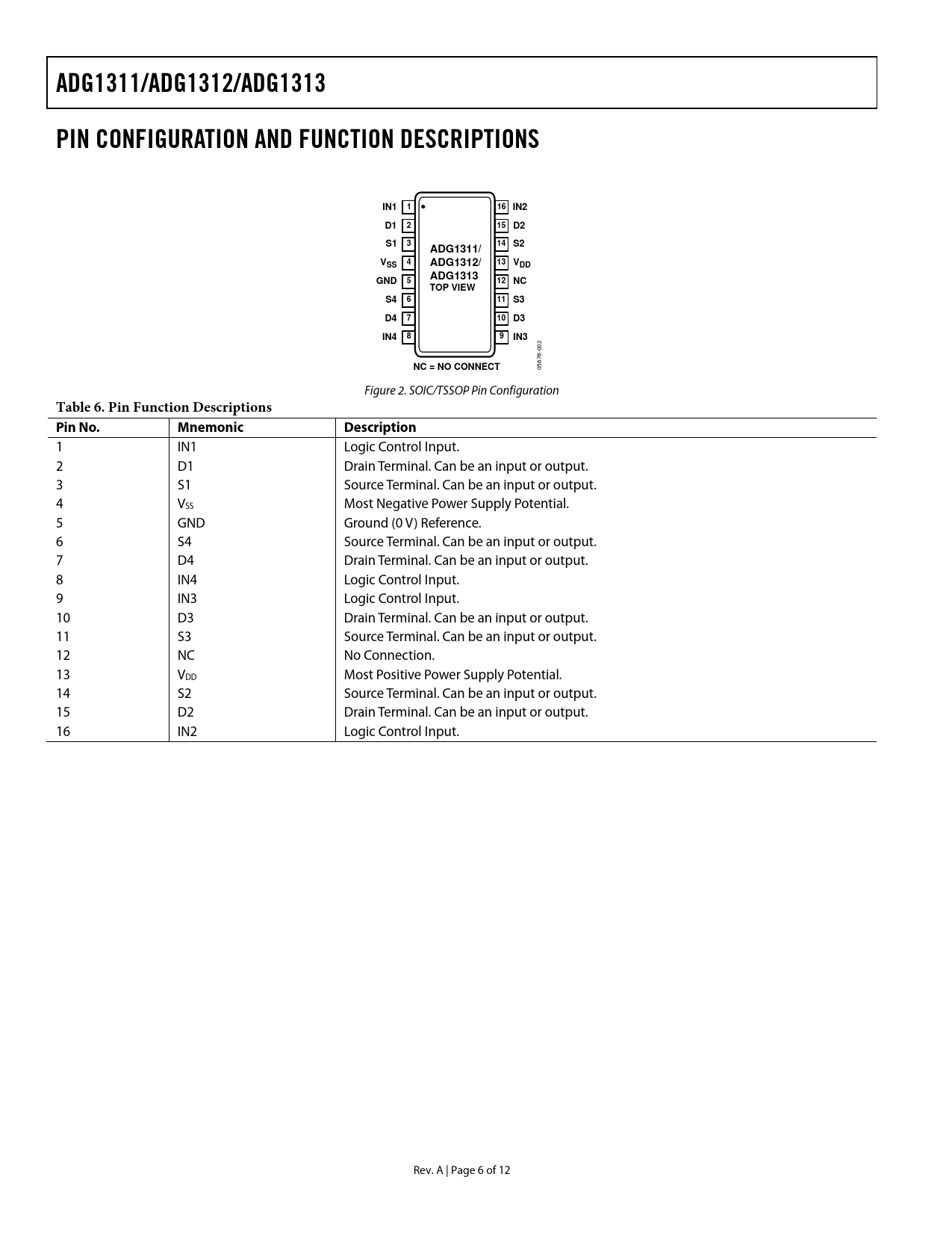 Seiten / Seite12 / 6 — ADG1311/ADG1312/ADG1313. PIN CONFIGURATION AND FUNCTION DESCRIPTIONS. …