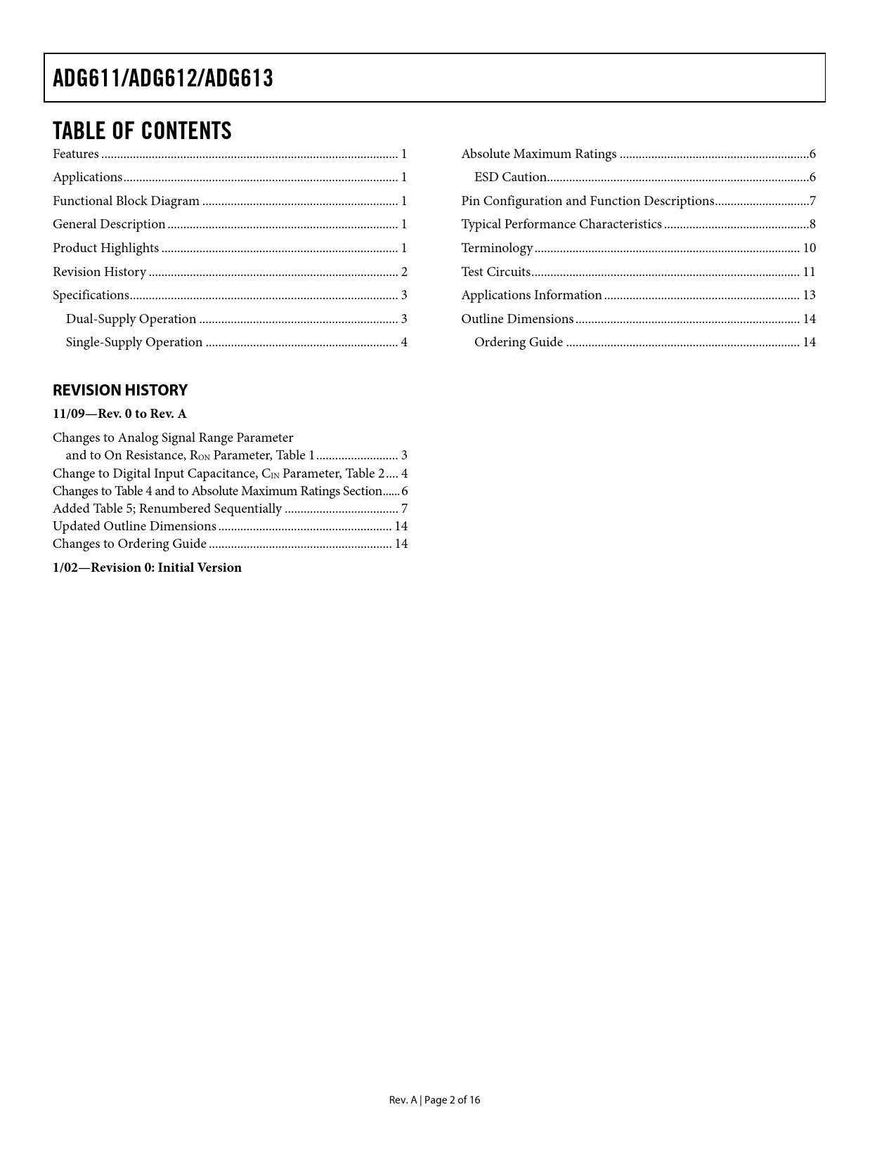 Seiten / Seite16 / 2 — ADG611/ADG612/ADG613. TABLE OF CONTENTS. REVISION HISTORY. 11/09—Rev. 0 …