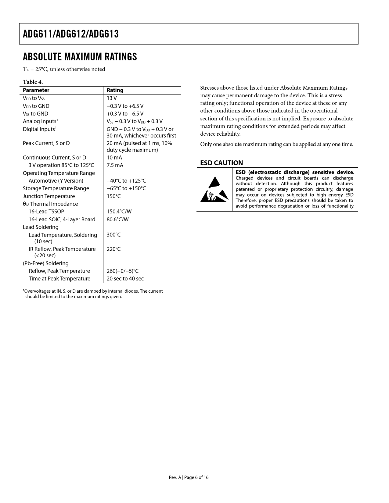 link to page 6 link to page 6 ADG611/ADG612/ADG613ABSOLUTE MAXIMUM RATINGS TA = 25°C, unless otherwise noted Table 4. Parameter Rating Stresses above those listed under Absolute Maximum Ratings may cause permanent damage to the device. This is a stress VDD to VSS 13 V rating only; functional operation of the device at these or any VDD to GND −0.3 V to +6.5 V other conditions above those indicated in the operational VSS to GND +0.3 V to −6.5 V section of this specification is not implied. Exposure to absolute Analog Inputs1 VSS − 0.3 V to VDD + 0.3 V maximum rating conditions for extended periods may affect Digital Inputs1 GND − 0.3 V to VDD + 0.3 V or 30 mA, whichever occurs first device reliability. Peak Current, S or D 20 mA (pulsed at 1 ms, 10% Only one absolute maximum rating can be applied at any one time. duty cycle maximum) Continuous Current, S or D 10 mA 3 V operation 85°C to 125°C 7.5 mA ESD CAUTION Operating Temperature Range Automotive (Y Version) −40°C to +125°C Storage Temperature Range −65°C to +150°C Junction Temperature 150°C θJA Thermal Impedance 16-Lead TSSOP 150.4°C/W 16-Lead SOIC, 4-Layer Board 80.6°C/W Lead Soldering Lead Temperature, Soldering 300°C (10 sec) IR Reflow, Peak Temperature 220°C (<20 sec) (Pb-Free) Soldering Reflow, Peak Temperature 260(+0/−5)°C Time at Peak Temperature 20 sec to 40 sec 1Overvoltages at IN, S, or D are clamped by internal diodes. The current should be limited to the maximum ratings given. Rev. A | Page 6 of 16 Document Outline FEATURES APPLICATIONS FUNCTIONAL BLOCK DIAGRAM GENERAL DESCRIPTION PRODUCT HIGHLIGHTS TABLE OF CONTENTS REVISION HISTORY SPECIFICATIONS DUAL-SUPPLY OPERATION SINGLE-SUPPLY OPERATION ABSOLUTE MAXIMUM RATINGS ESD CAUTION PIN CONFIGURATION AND FUNCTION DESCRIPTIONS TYPICAL PERFORMANCE CHARACTERISTICS TERMINOLOGY TEST CIRCUITS APPLICATIONS INFORMATION OUTLINE DIMENSIONS ORDERING GUIDE