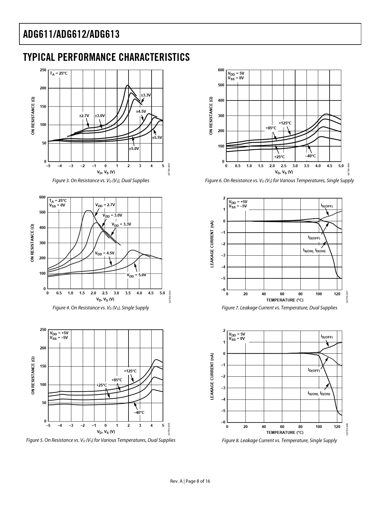 75 02 02 Figure 4. On Resistance vs. VD (VS), Single Supply Figure 7. Leakage Current vs. Temperature, Dual Supplies